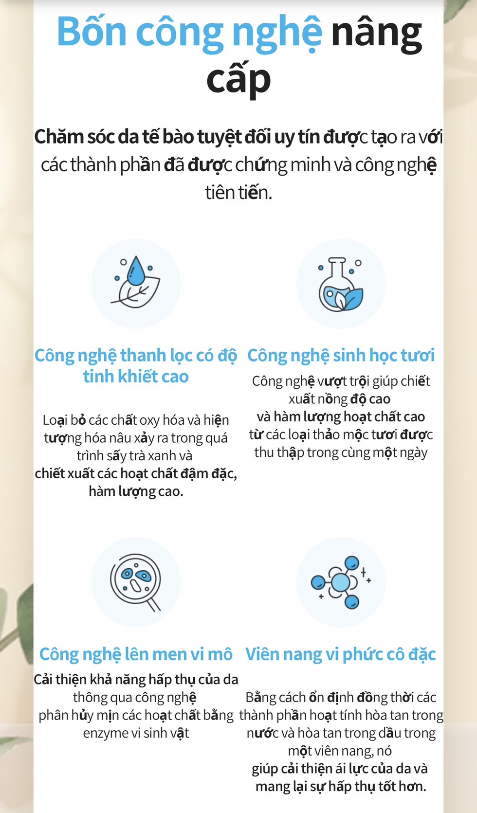 - Với thành phần chính là chiết xuất từ tinh chất trà xanh thảo dược ngăn chặn tình trạng lão hoá hiệu quả.