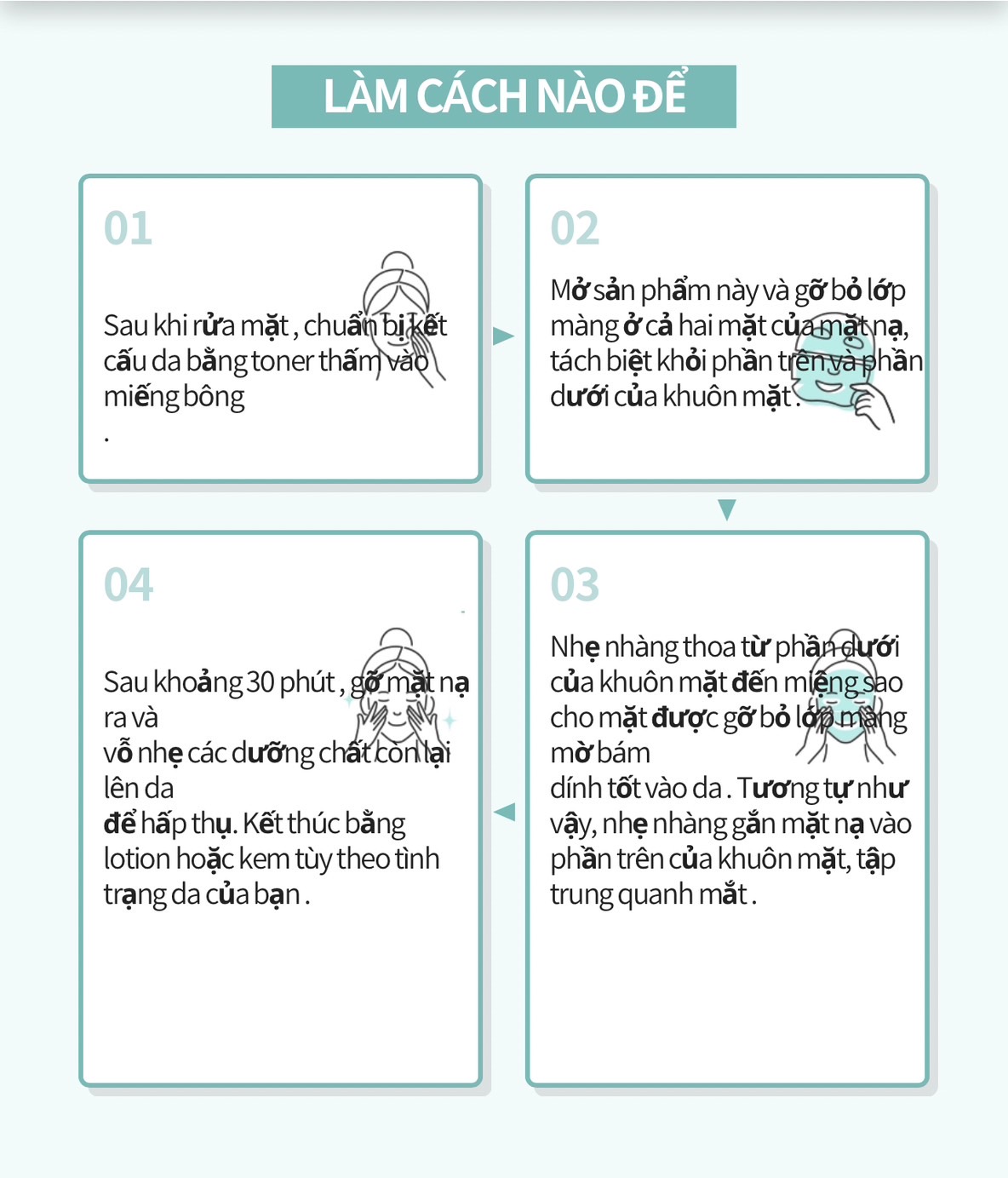 + Chờ 30 phút cho các dưỡng chất hấp thụ sâu vào da. Sau khi tháo mặt nạ ra, có thể sử dụng kem hoặc sữa dưỡng da cho bước tiếp theo.