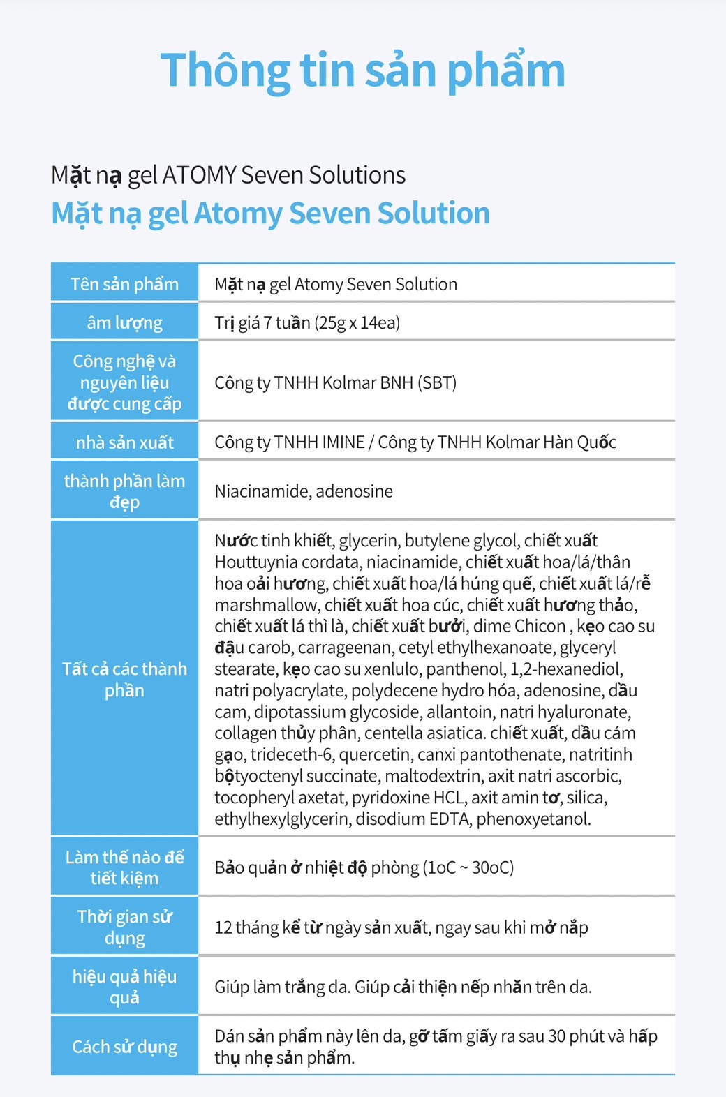- 7 chất độc hại thường có trong các loại mặt nạ dưỡng da khác nhưng không có trong Mặt nạ dưỡng da Atomy 7 Solutions Gel Mask : Artificial Color+scent, Paraben, Mineral oil, Benzophenone, Talc, Sulfate.