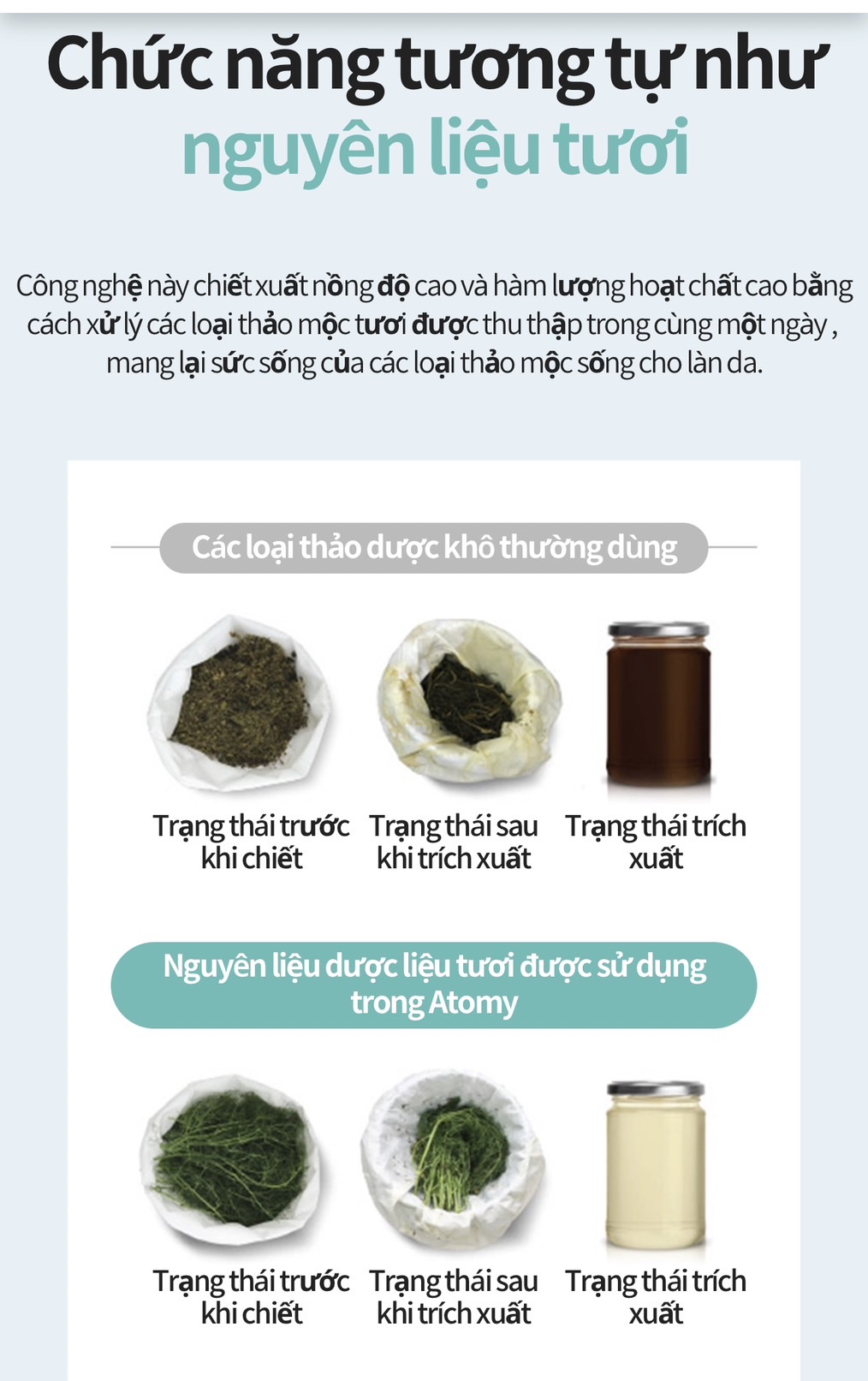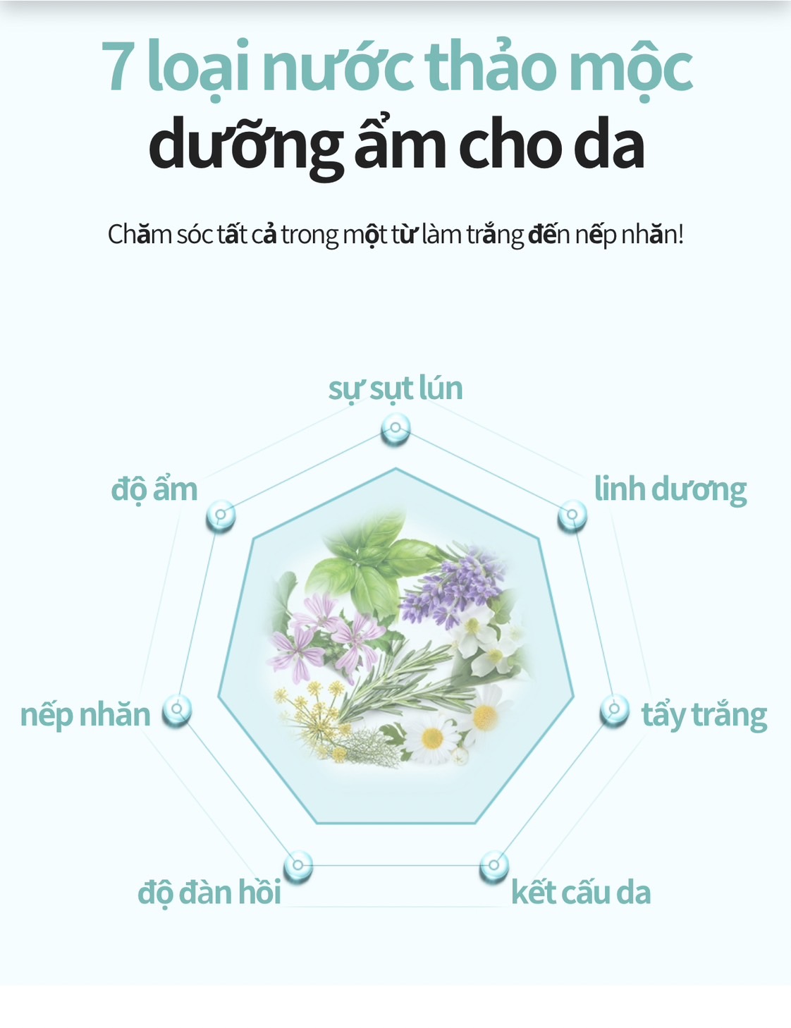 - 7 Loại thảo mộc tự nhiên: Diếp cá (Houttuynia Cordata), oải Hương (Lavender), Húng quế (basil), Thược dược (Althaea Officinalis), Cúc La Mã (Chamomile), Hương thảo (Rosmarinus Officinalis), Thì là (Fennel). Kết hợp với công nghệ cao chiết xuất: Dầu cám gạo (Rice bran oil), Chiết xuất Sericin từ tơ tằm, Hoạt chất Dipotassium Glycyrrhizate trong cam thảo. Cùng các đặc tính cần thiết để tái tạo làn da: Calming, Nutrition, Breghtening, Texture, Elasticity, Wrinkle, Moisture.