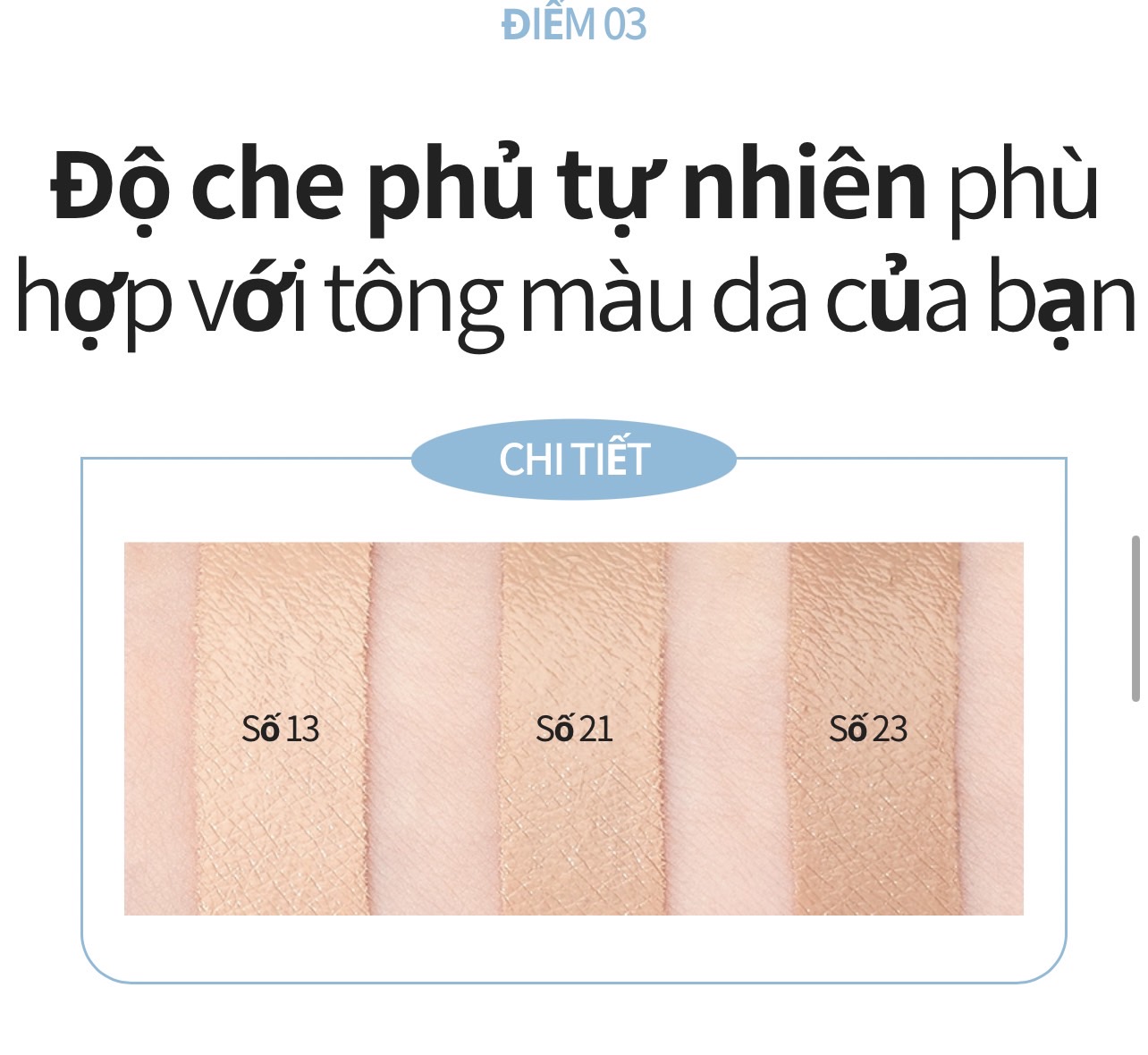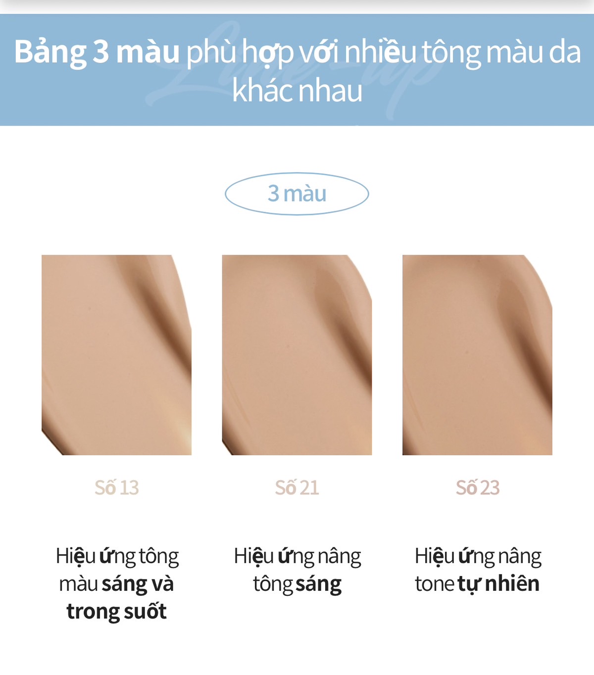 Có 3 màu để bạn lựa chọn phù hợp với làn da. Màu da sáng (13), màu da tự nhiên (21), màu da sẩm (23)