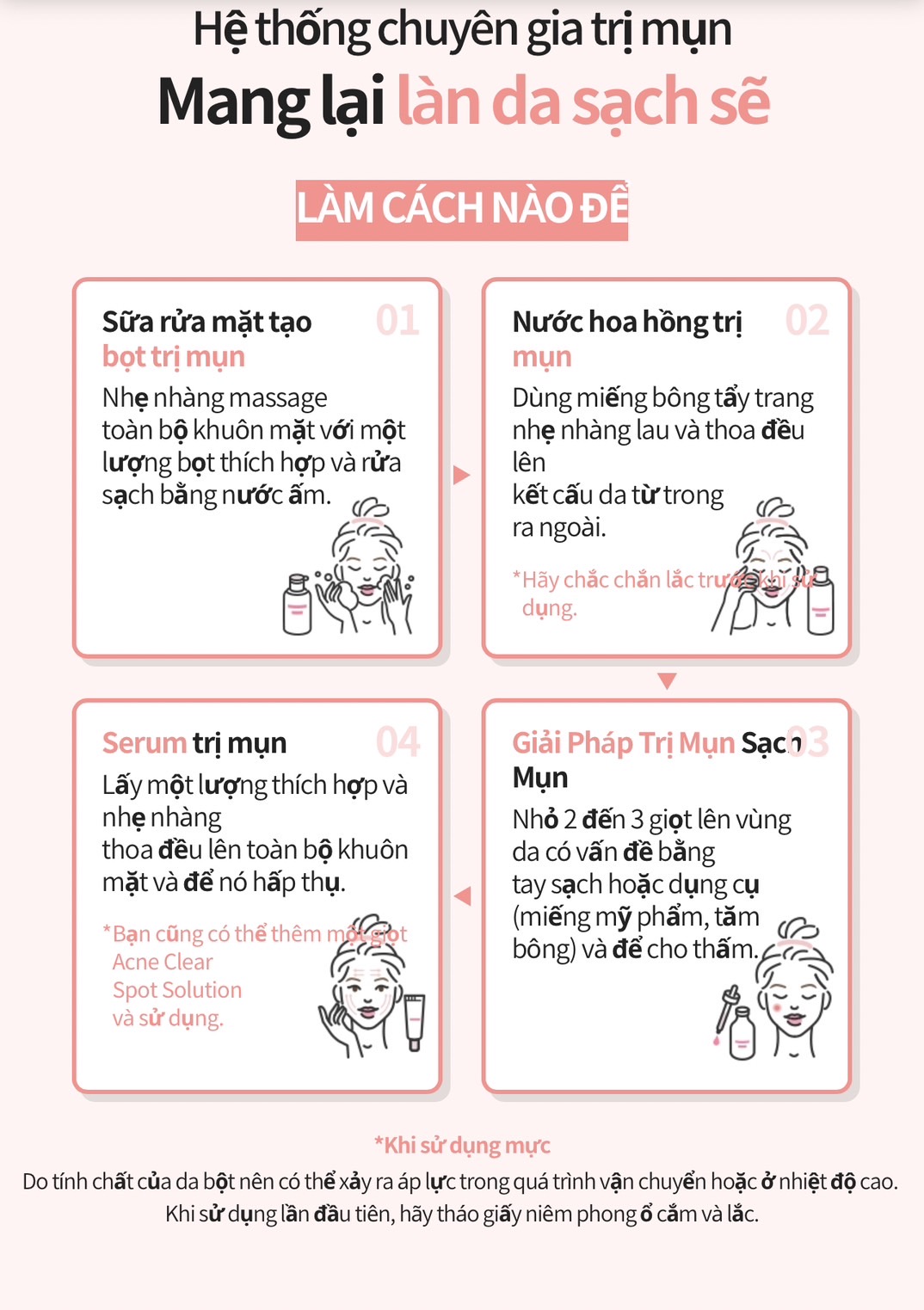 - Một giải pháp rõ ràng một cửa, Hệ thống chuyên gia trị mụn trứng cá nguyên tử.Từ sản phẩm dung dịch AC trước đó, chất tẩy rửa tạo bọt, nước dưỡng hoa hồng toner và serum tái tạo da được thêm vào cho sự ra đời mới của dòng Chuyên gia trị mụn 4 bước.