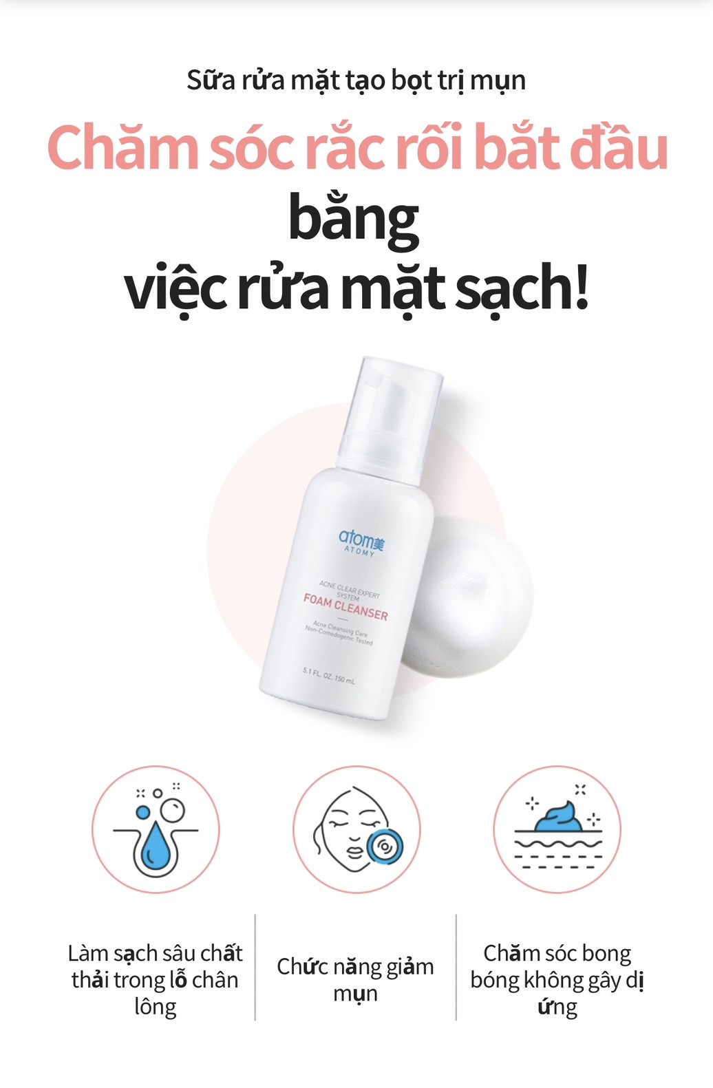 Sữa rửa mặt diệt khuẩn gây mụn, làm sạch tuyến nhờn, ngăn mụn tái phát - Atomy Acne Clear Expert System Foam Cleanser 150ml - 애터미 아크네 클리어 폼클렌저 - Атоми Акне Эксперт Пенка для Умывания