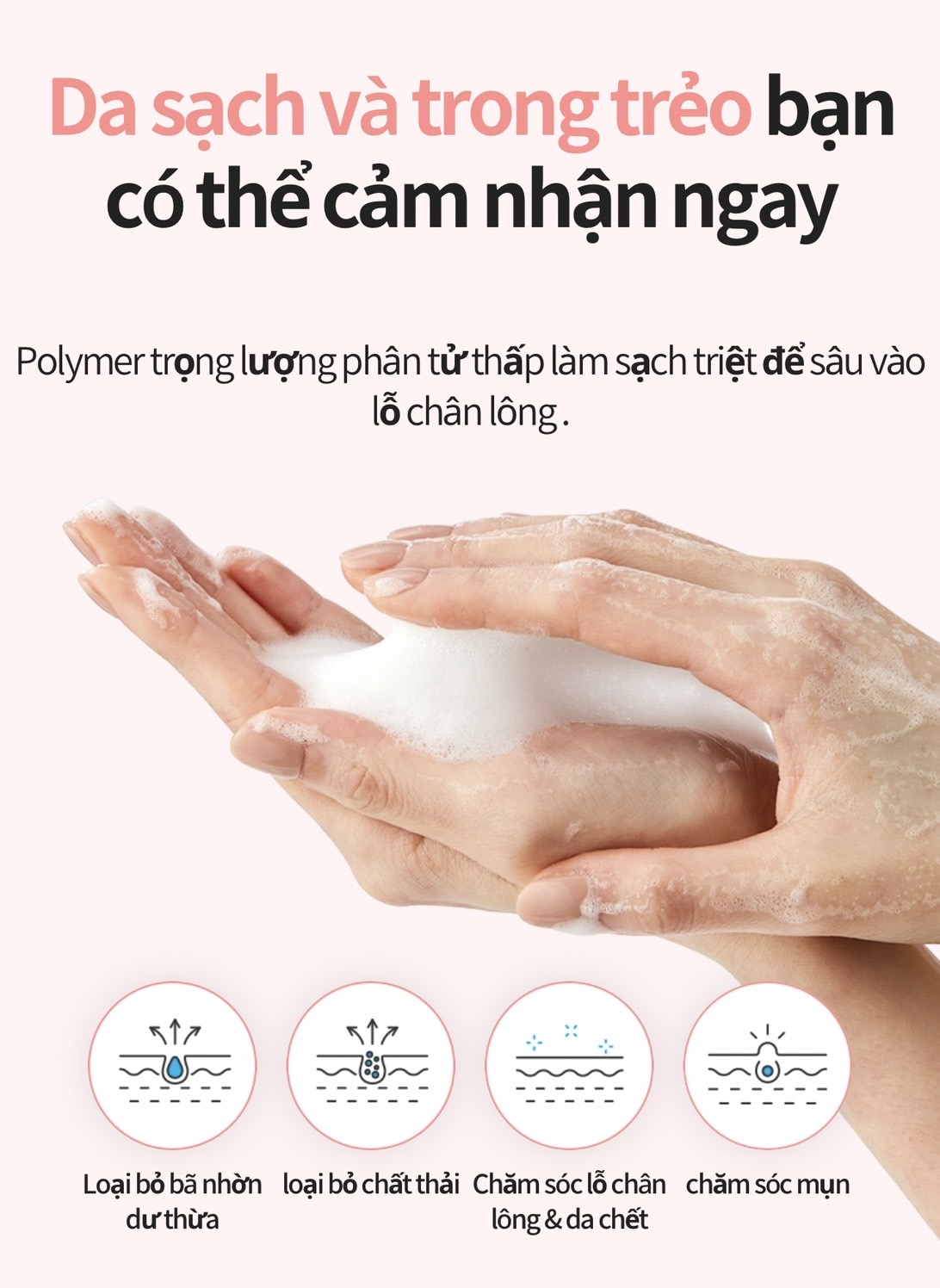 Phân tử Polymer thấp giúp làm sạch sâu hơn, hòa tan oxit bã nhờn trong lỗ chân lông, làm thông thoáng lỗ chân lông và diệt vi khuẩn gây mụn.