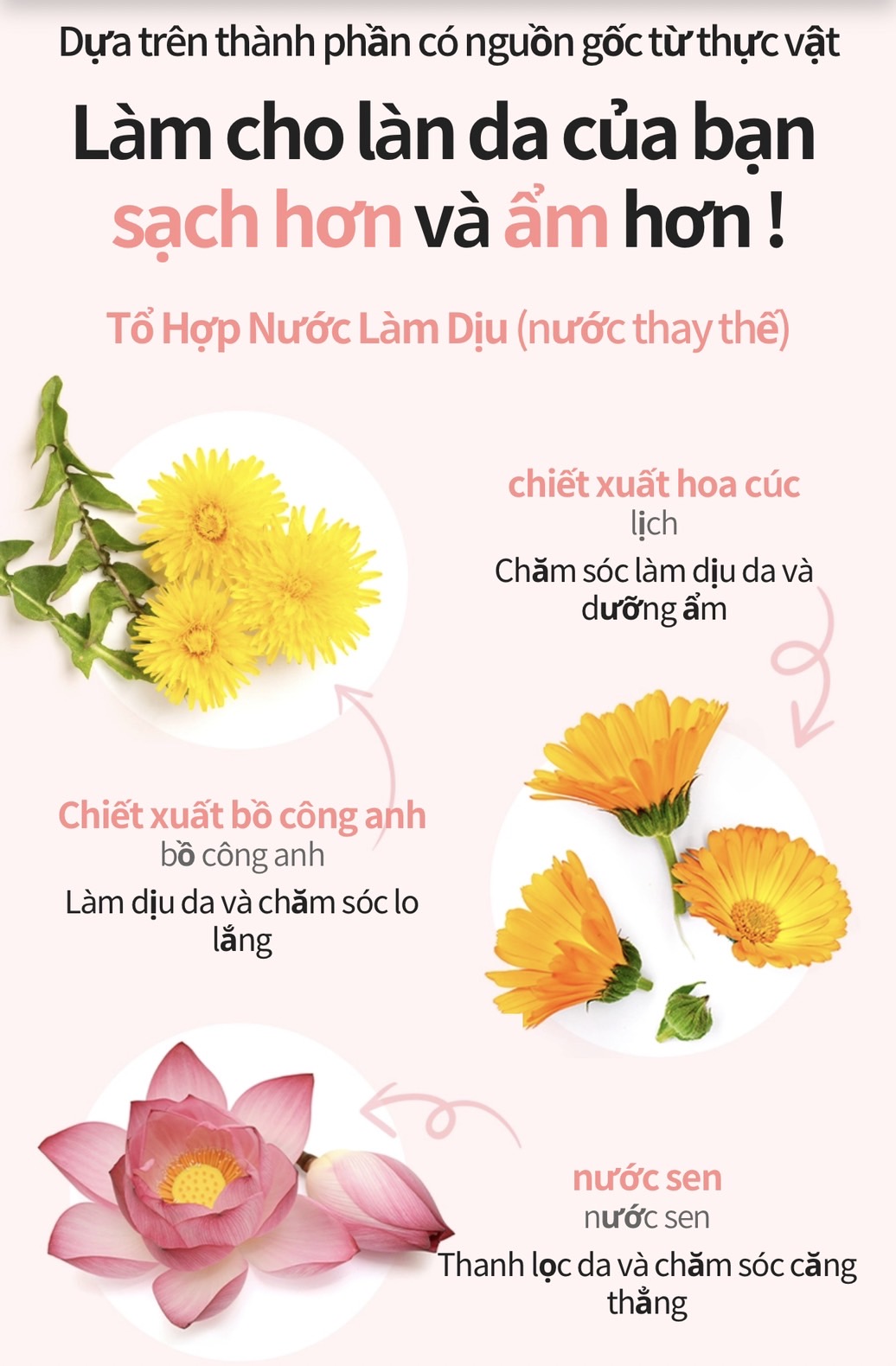 Thành phần: Chiết xuất, hoa cúc, chiết xuất Bồ Công Anh, hoa sen, nấm thượng hoàng, hương thảo, húng quế….