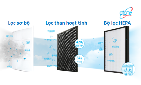 Bước 2 Lọc khử mùi bằng than hoạt tính: Tổng khối lượng than hoạt tính trong máy lọc không khí Atomy là 210g x 2 miếng lọc. Diện tích bề mặt than của 420g này tương đương với 84 sân bóng đá tiêu chuẩn. Do đó, nó có thể lọc hầu như tất cả các mùi hôi cùng với các chất độc hại có trong không khí : formaldehyd, axit axetic, amoniac, Acetaldehyd