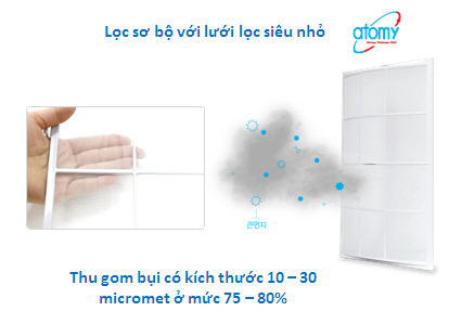 Bước 1: Bộ lọc sơ bộ: Bộ lọc cực kỳ tốt với lưới mịn hơn vật liệu lưới thông thường giúp loại bỏ bụi, lông, lông thú cưng, phấn hoa … Thu gom bụi từ 10 ~ 30 miromet ở mức 75 ~ 80% trở lên. Có thể tẩy rửa dễ dàng.