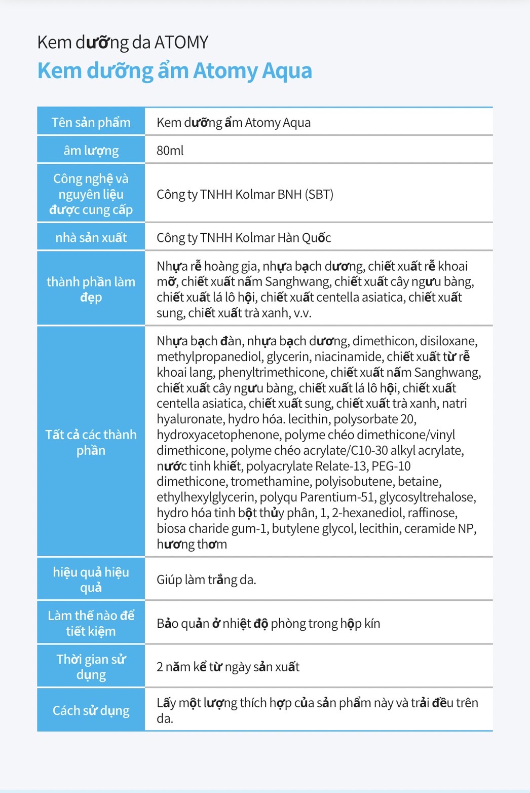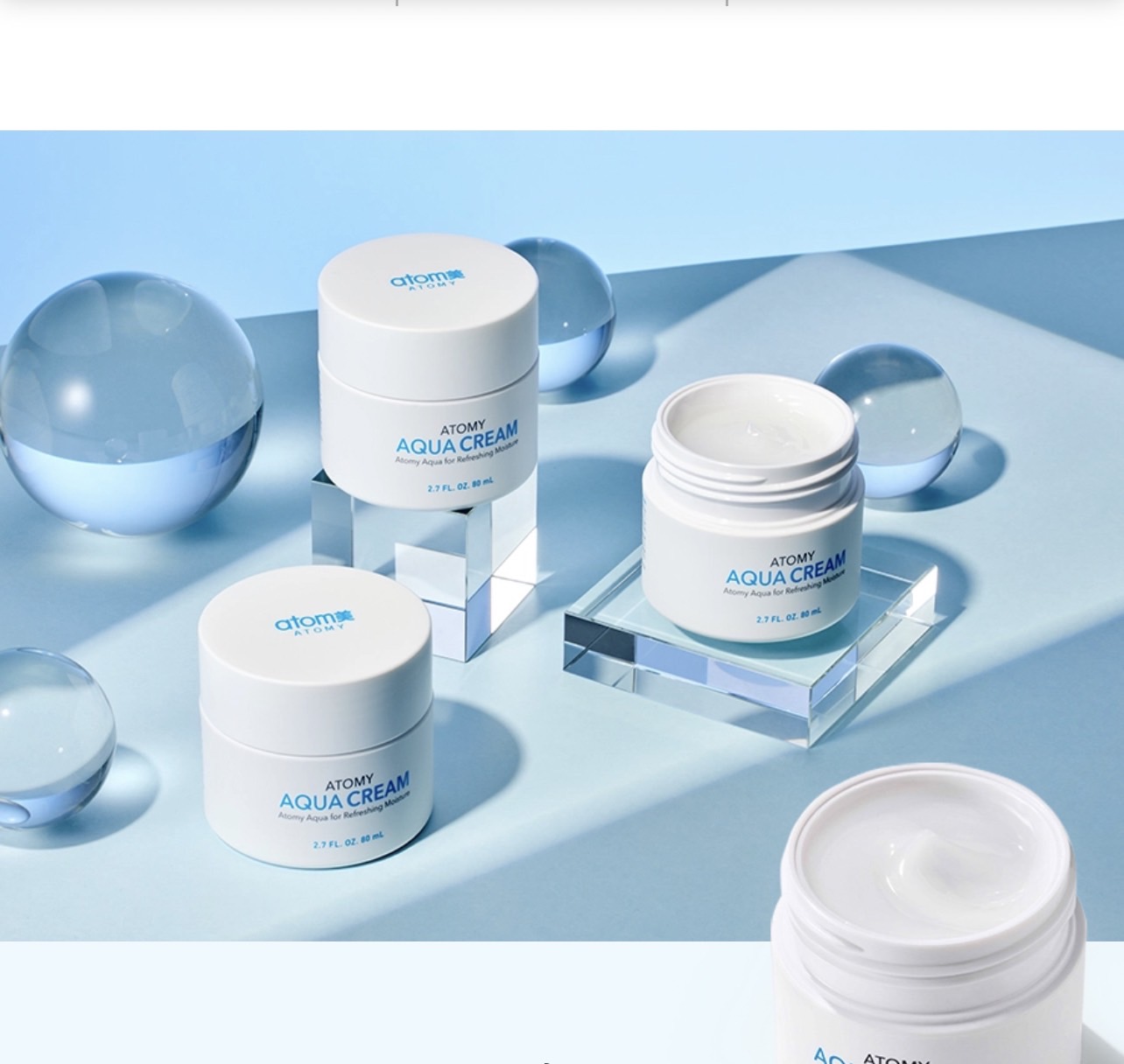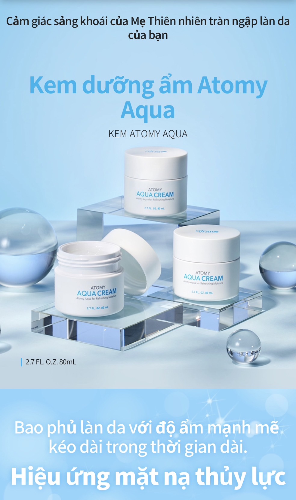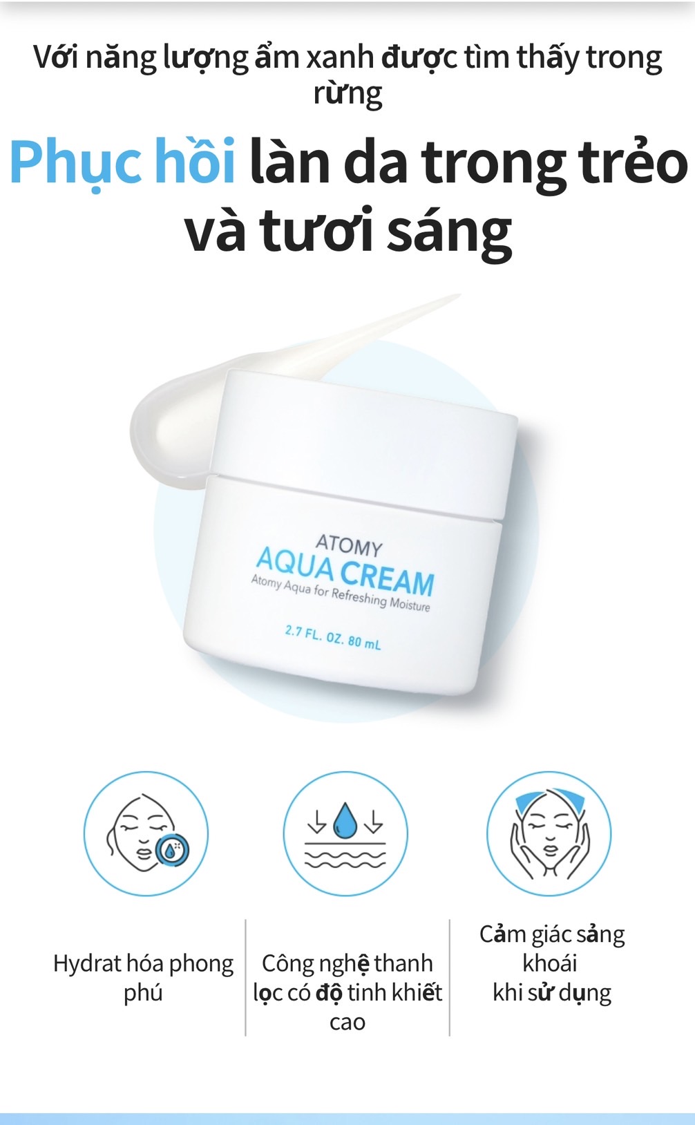 - Với chiết xuất đặc biệt từ tre Nhật Bản và Brich sáp từ cây bạch dương trắng, ATOMY Aqua Cream giúp giữ ẩm cho da, chống dị ứng và chống lão hóa, thẩm thấu nhanh. Dòng sản phẩm cải thiện tính năng cho 3 loại da như sau: