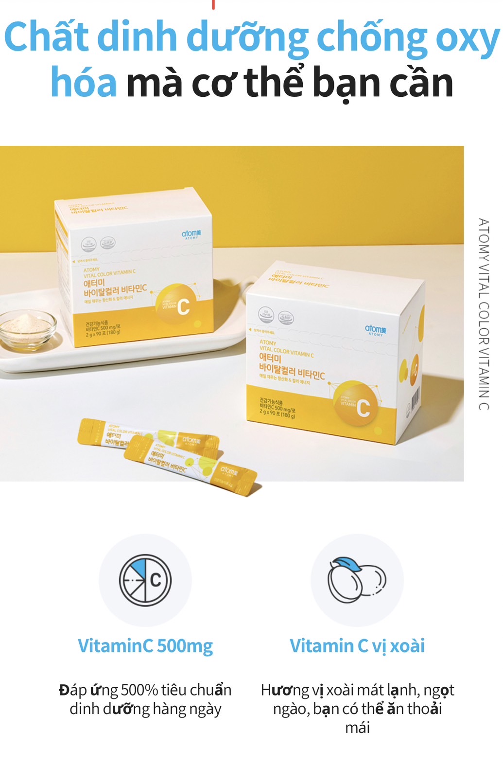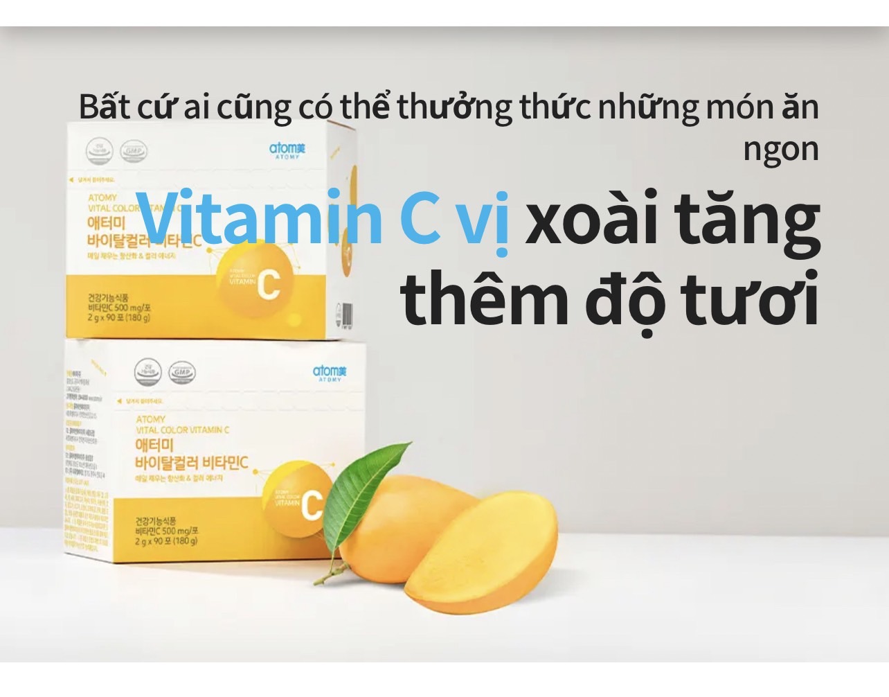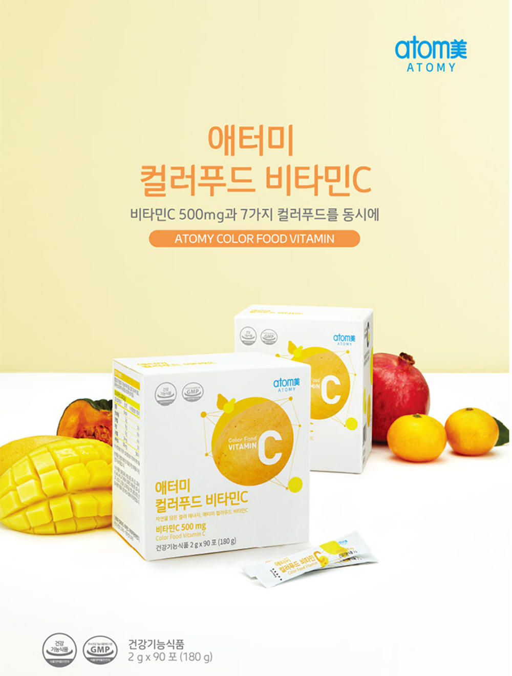 Atomy Color Food Vitamin C cung cấp Vitamin C thiết yếu cho cơ thể với thành phần gồm 7 loại thực vật chứa nhiều vitamin C trong tự nhiên : Xoài, Dâu tây, Lựu, Bí ngô, Cam đường, Nấm thượng hoàng, Nghệ