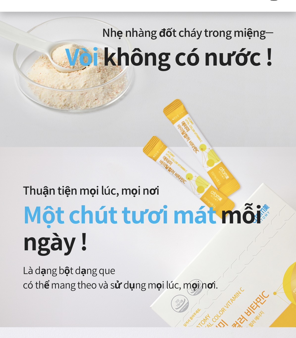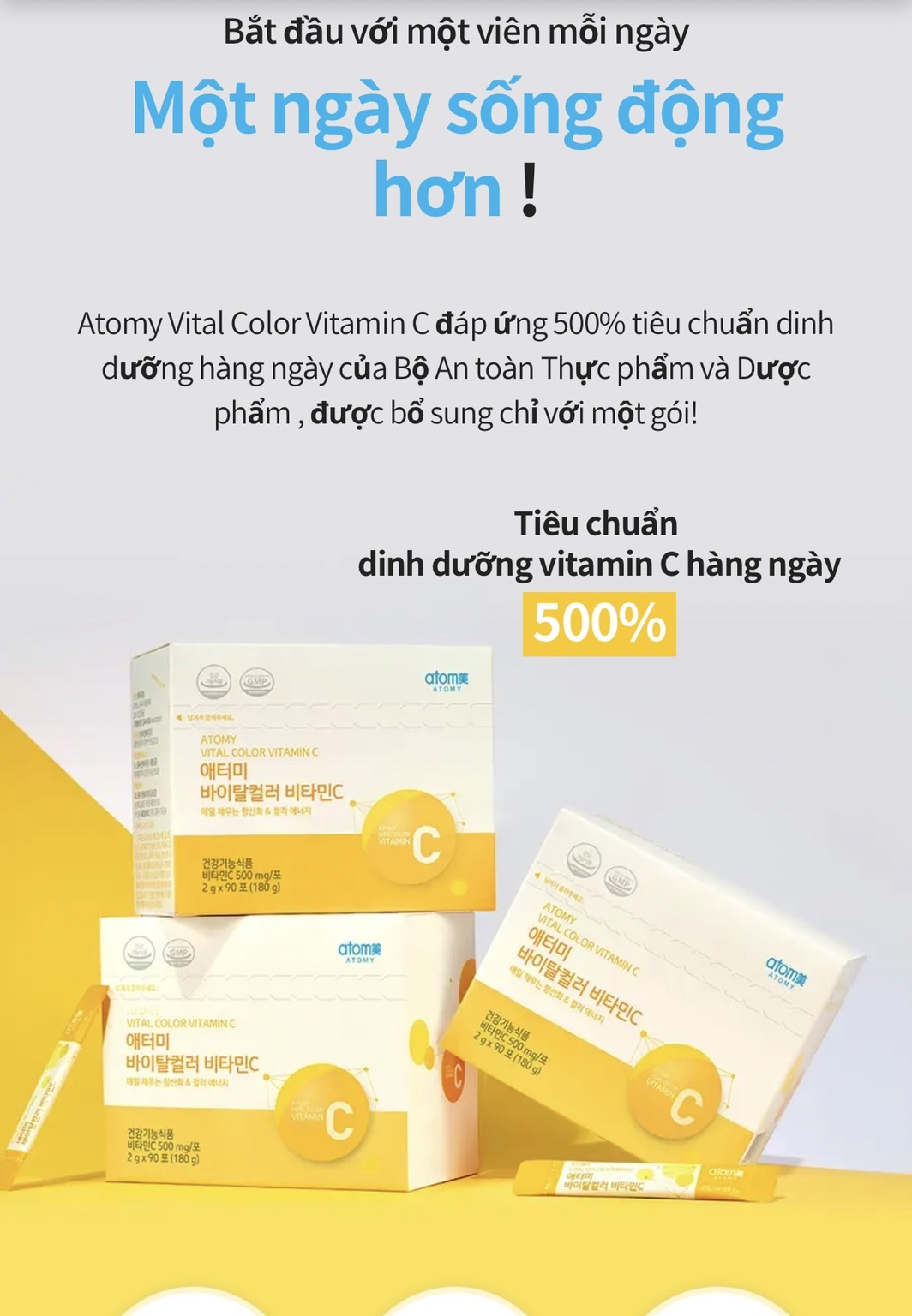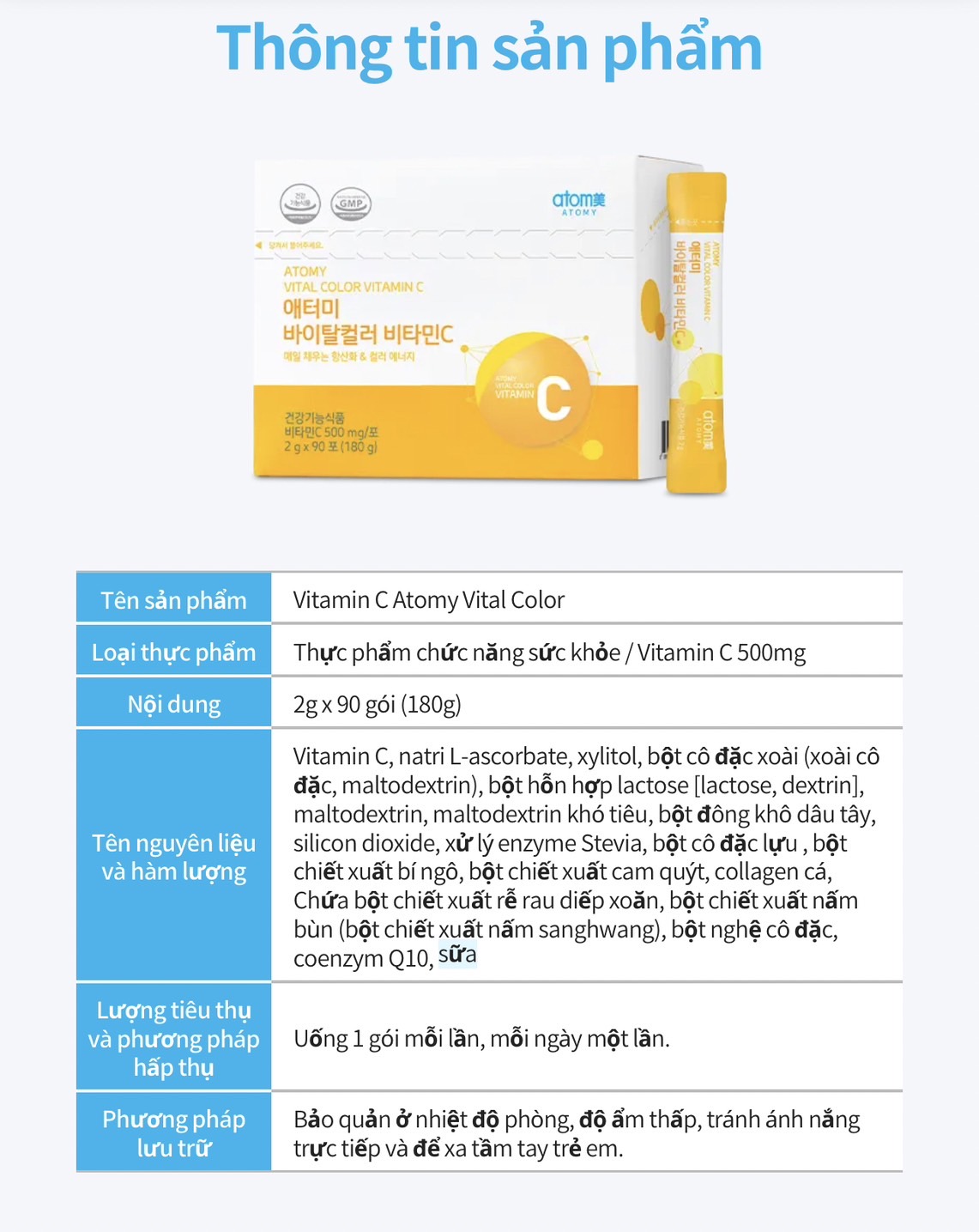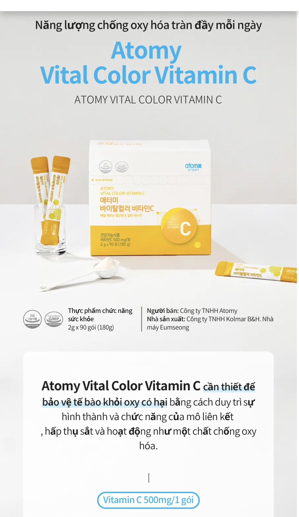 Atomy Color Food Vitamin C cung cấp Vitamin C thiết yếu cho cơ thể với thành phần gồm 7 loại thực vật chứa nhiều vitamin C trong tự nhiên : Xoài, Dâu tây, Lựu, Bí ngô, Cam đường, Nấm thượng hoàng, Nghệ