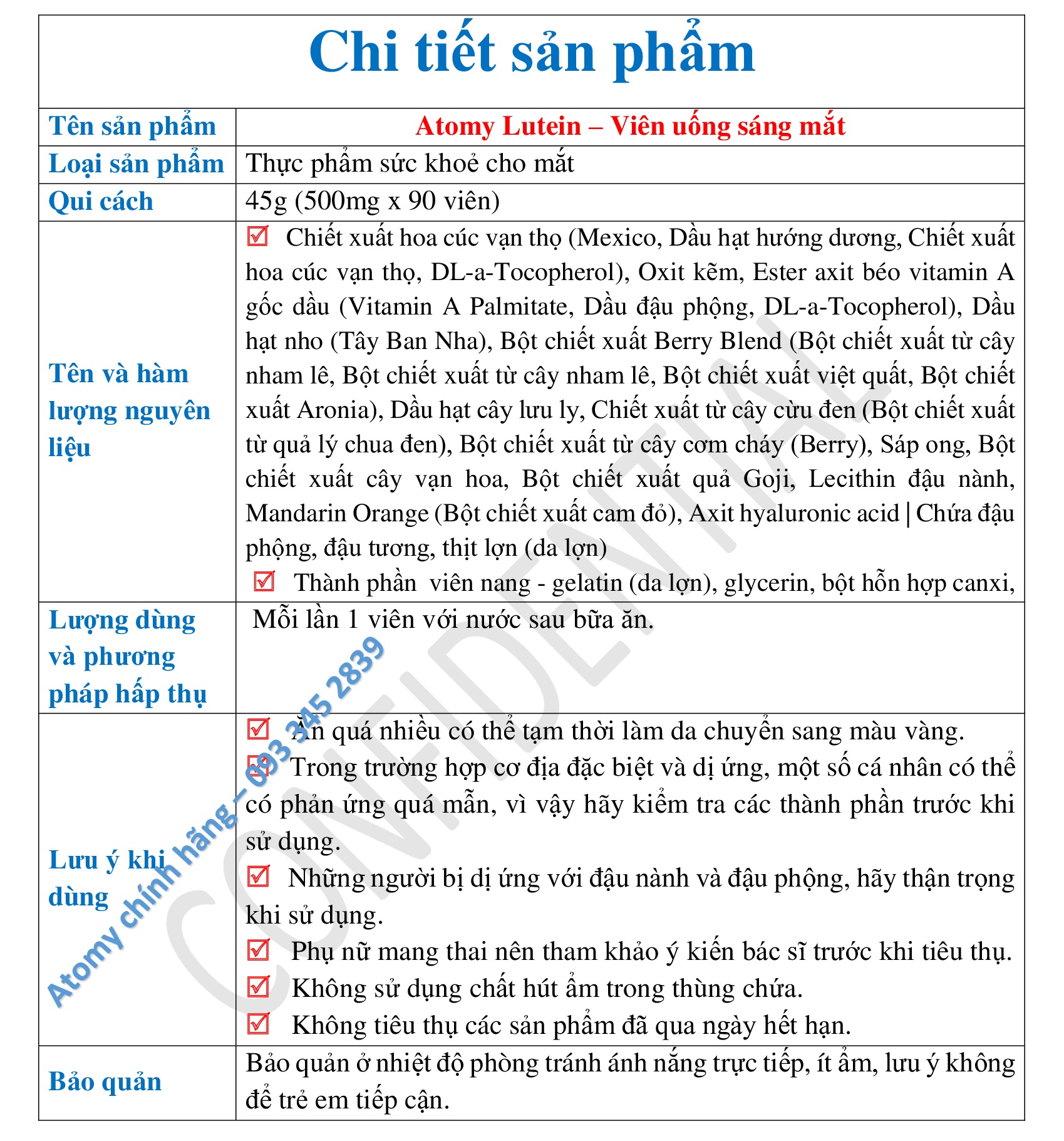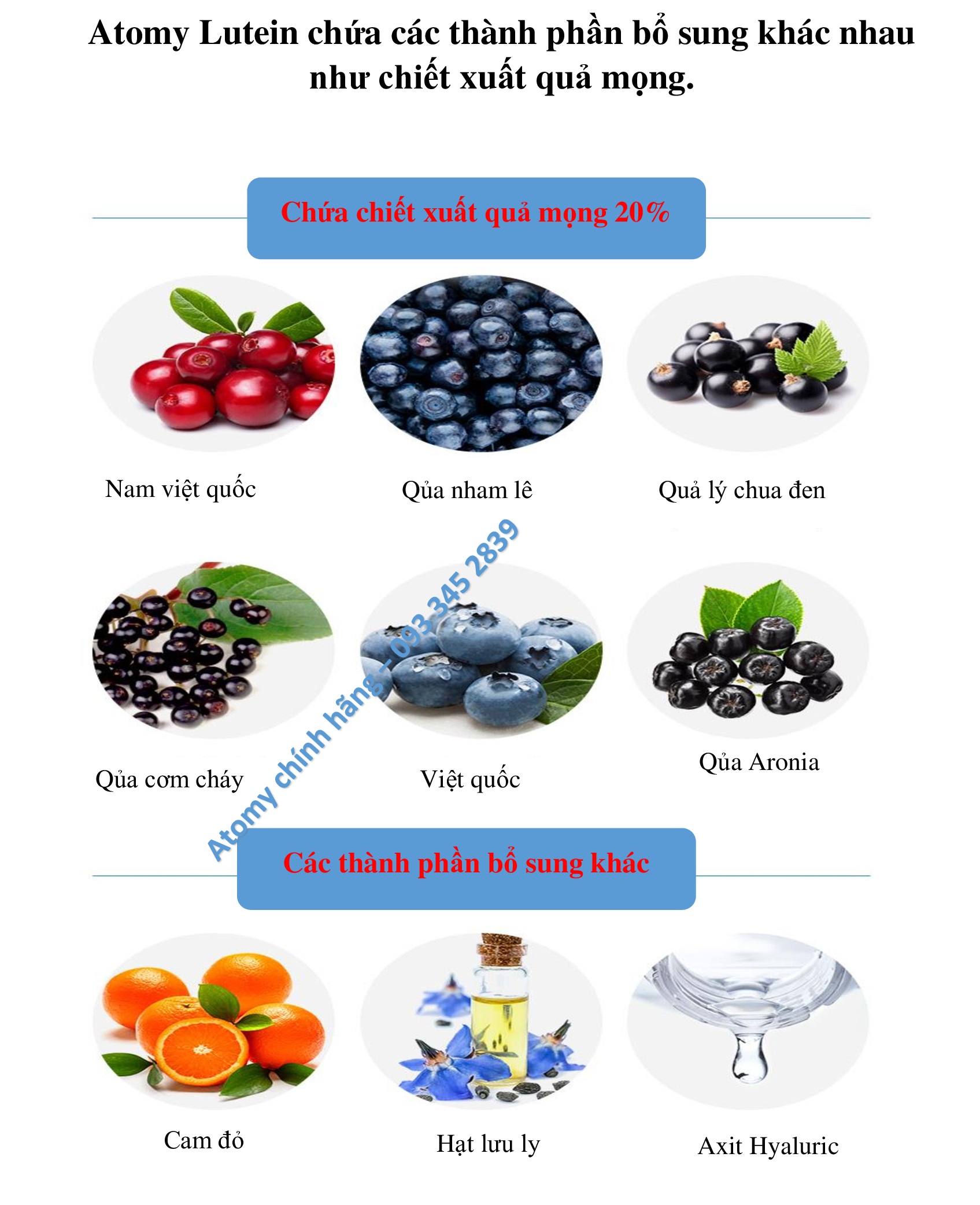 * Các thành phần phụ khác: hàu đường (cam đỏ), dầu hạt lưu ly, axit hyaluronic