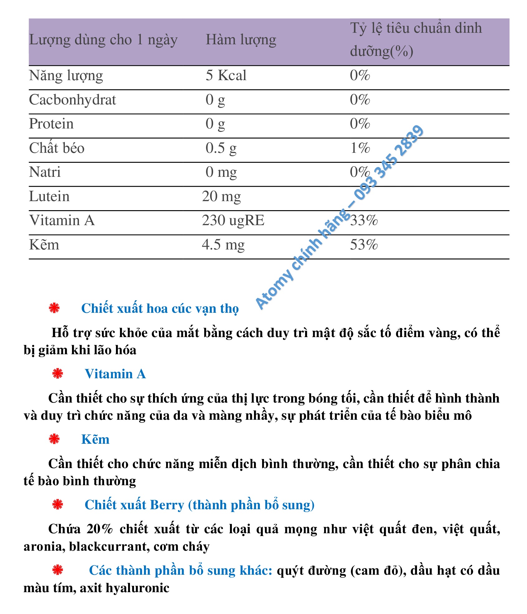 Kẽm cần thiết cho chức năng miễn dịch bình thường, cần thiết cho chiết xuất quả mọng phân chia tế bào bình thường (nguyên liệu phụ) Chứa 20% chiết xuất từ các loại quả mọng như việt quất đen, việt quất, aronia, nho đen, cơm cháy, ...