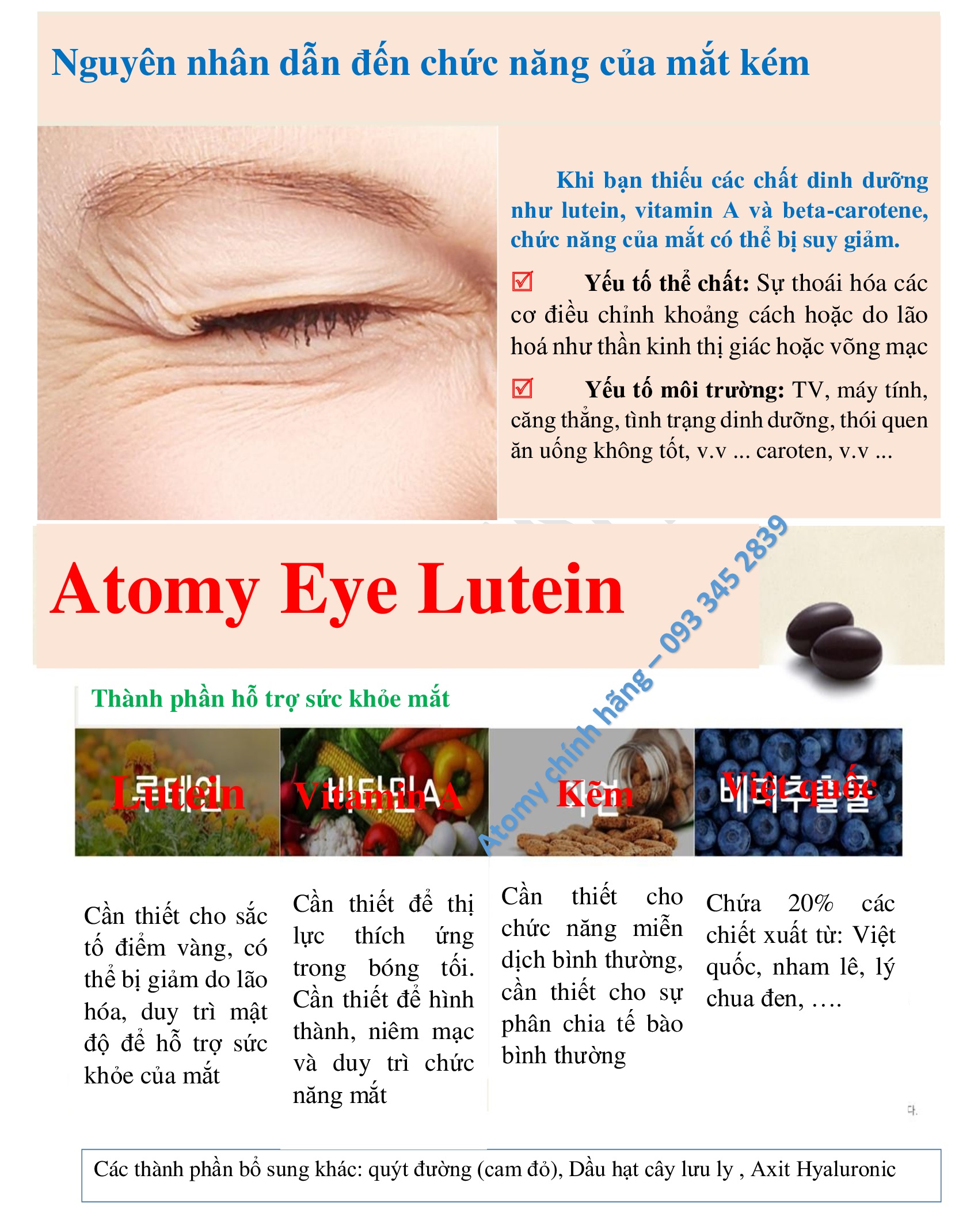 Thành phần: Lutein là tiền chất của Vitamin A tự nhiên bao gồm (Hoa vạn thọ, Dầu hoa hướng dương, Lutein, và Vitamin E từ thiên nhiên), Oxit kẽm (zinc oxide), Vitamin A fatty acid ester gồm (Vitamin A từ thực vật, Dầu đậu phộng, Vitamin E từ thiên nhiên), Dầu hạt nho (Grapeseed oil), Chiết xuất hỗn hợp (Việt quốc Bilberry,Mạn Việt quốc Mountain Cranberry, Qủa anh đào dại Aronia Berry), Dầu lưu ly (Borage Oil), Nho chuỗi ngọc đen (Black Currant), Trái cơm cháy (Elderberry), Sáp ong trắng (Beeswax), Hạt Cassia, Qủa câu kỷ tử (Goji Berry), Mầm hạt đậu nành (Soybean Lecithin), Cam đỏ (Red Orange), Hyaluronic Acid.