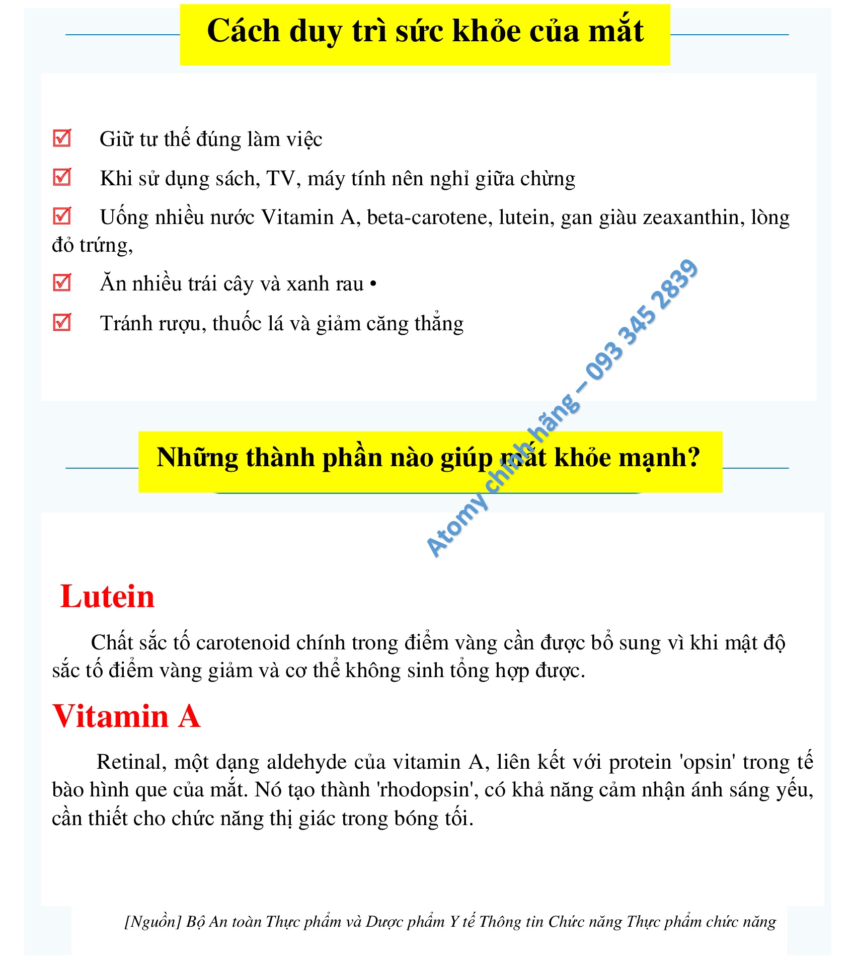 Vitamin A là gì? Vitamin A Có trong thức ăn động vật Thức ăn từ thực vật có màu vàng xanh chứa carotenoid, một tiền chất của vitamin A Cần thiết cho sức khỏe của mắt. Võng mạc của mắt chuyển đổi ánh sáng thành tín hiệu để truyền đến các dây thần kinh não. Vitamin A là cần thiết cho hoạt động thị giác tại thời điểm này Để duy trì nó, vitamin A và protein'Opsin 'phải được kết hợp để tạo ra'Rodopsin'- Nếu thiếu vitamin A, rhodopsin không thể hình thành trong tế bào que, gây khó nhìn. chúng có nhiều trong gan sẫm màu, cà rốt, khoai lang, hoa hướng dương, Chứa nhiều cà chua, hải sản, men bia, rau bina, rau mùi tây, củ cải, bí đỏ, táo, tỏi tây, v.v. |