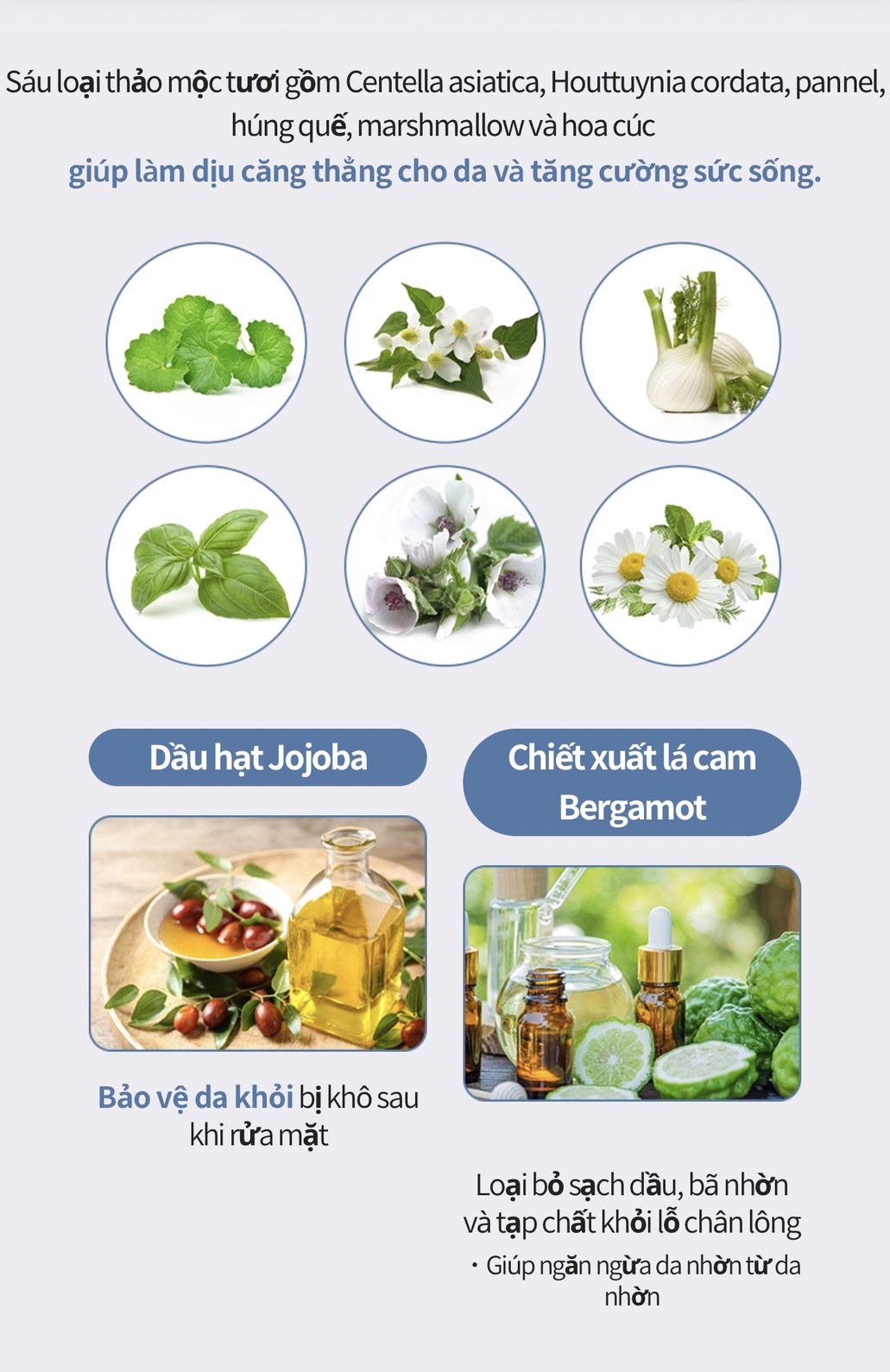 🌾Với chiết xuất từ 6 loại thảo mộc tươi ( Thì là, Hoa Cúc, Húng Quế, Eoseongcho, Centella Asiatica, Marshmallo) giúp làm căng da, tăng thêm sức sống cho da.