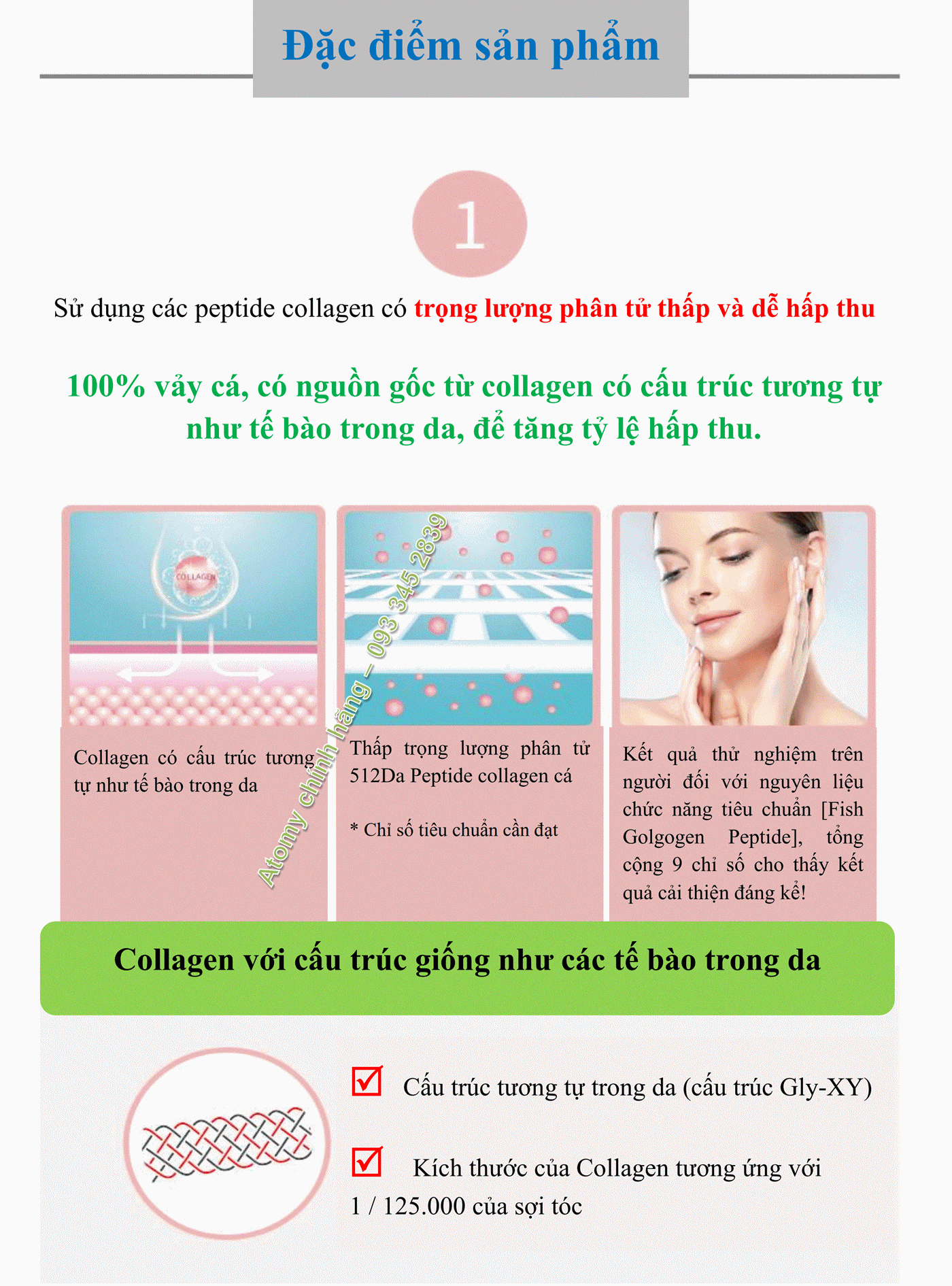 Atomy inner Collagen là sản phẩm được chiết xuất 100% từ vãy cá, trích xuất các Peptide Collagen có cùng cấu trúc Collagen của người cùng với đó là trọng lượng phân tử thấp chỉ đạt 512 Da nên rất dễ hấp thu vào cơ thể người