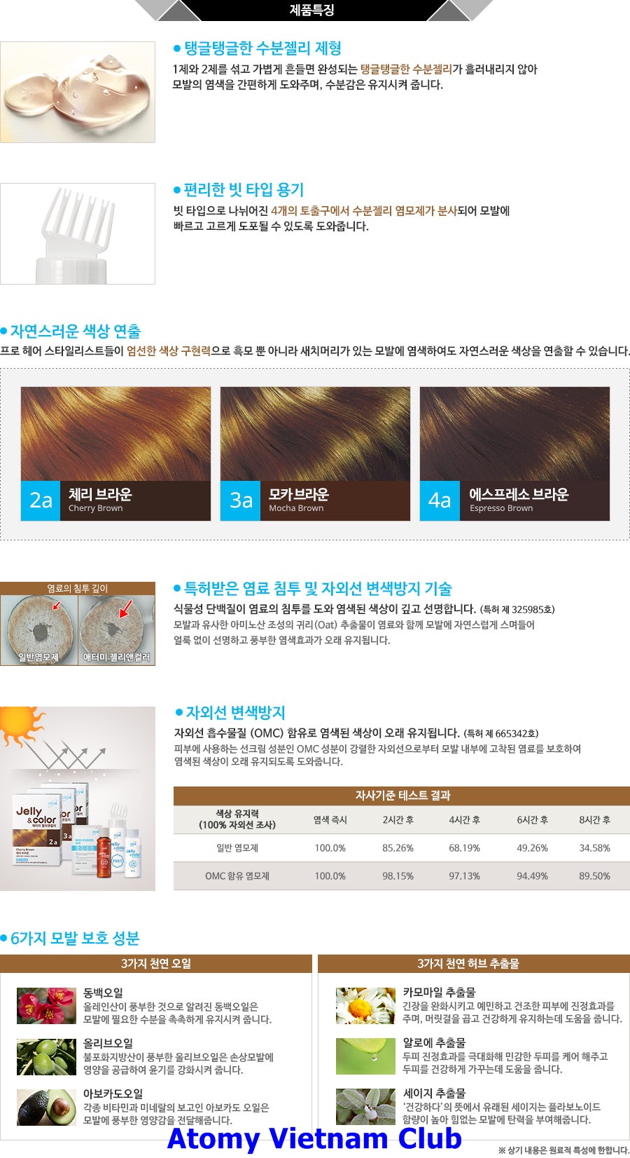 - Thuốc nhuộm tóc Atomy Jelly & Color giữ màu lâu, chăm sóc tóc hư tổn, có thể phản chiếu tia tử ngoại của ánh nắng mặt trời gây hư tổn cho tóc.