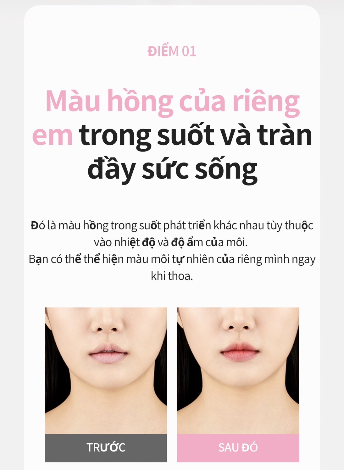 - Đặc biệt Lip Glow còn làm mờ thâm môi theo thời gian, dùng thường xuyên giúp tái tạo màu môi tươi sáng hơn.
