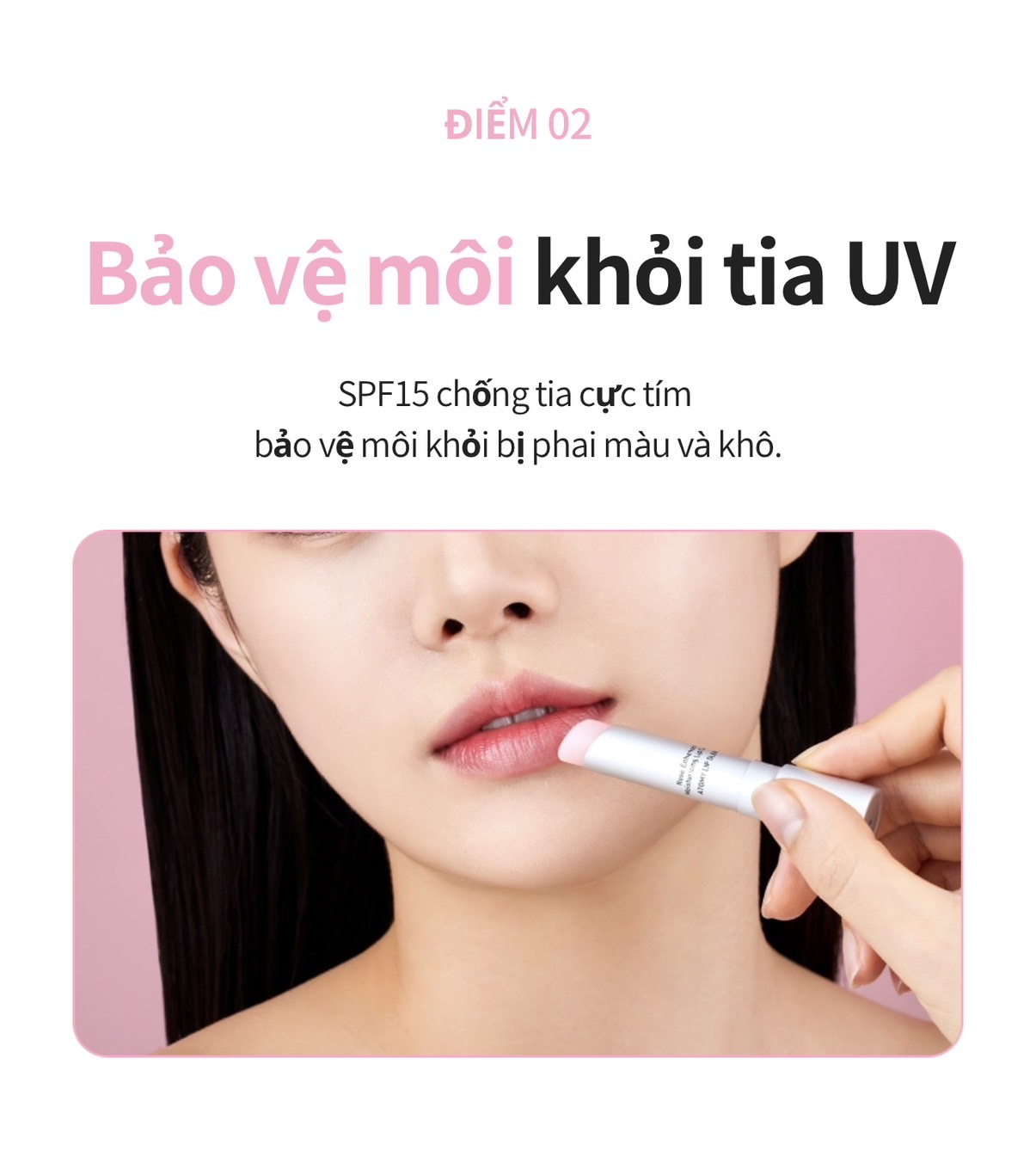 - Công thức 3 trong 1 các tác dụng giữ ẩm chống nứt môi, chống nắng với SPF 15, và tái tạo màu cho môi.