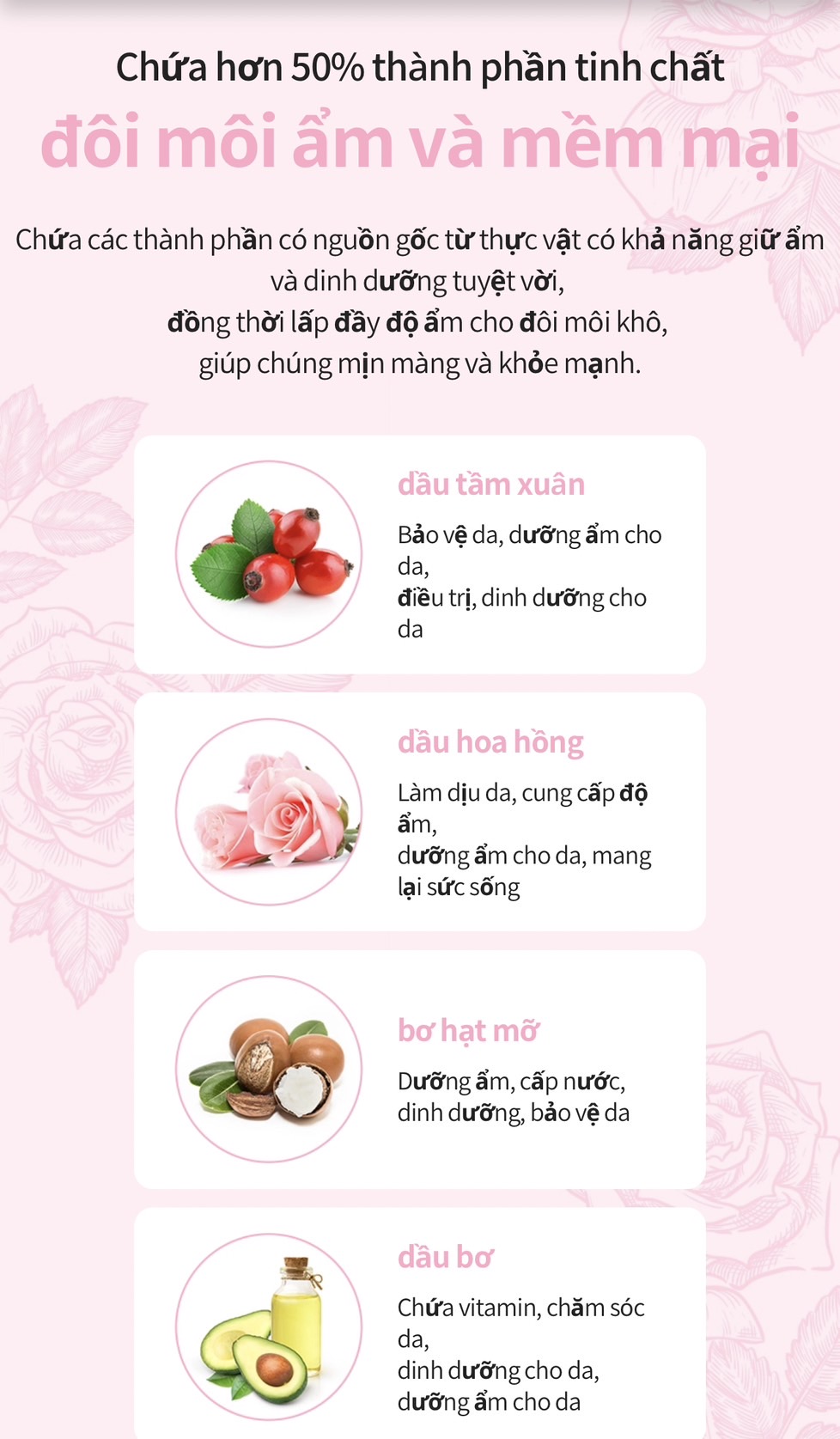 Thành phần: Tinh dầu chiết xuất từ nụ tầm xuân, tinh dầu hoa hồng, bơ hạt mỡ, tinh dầu jojoba.