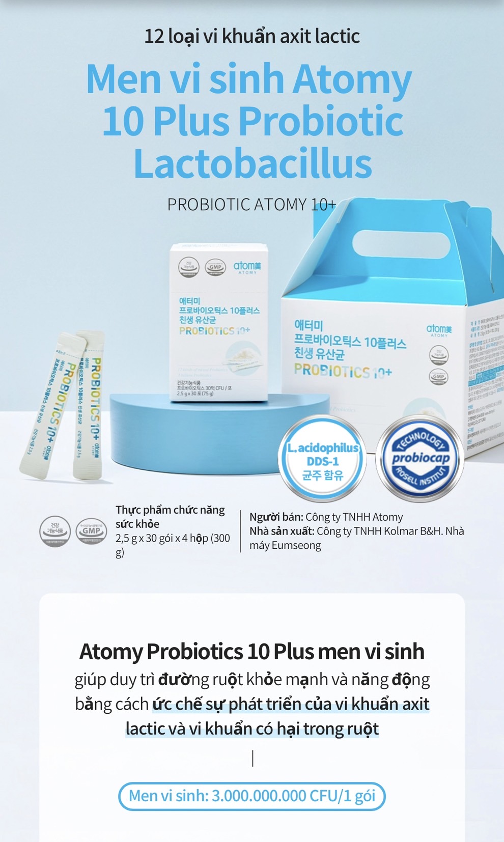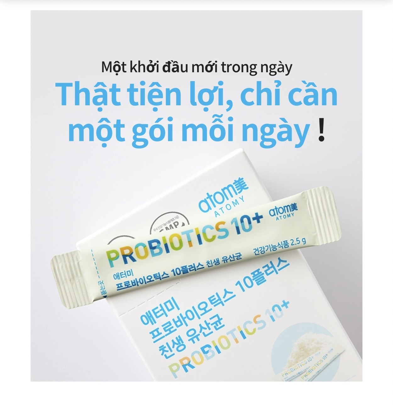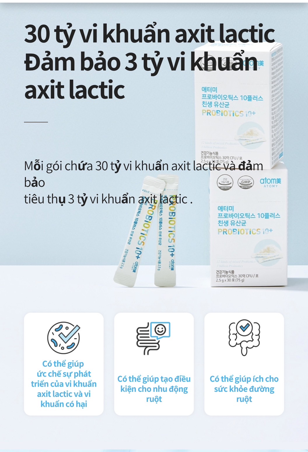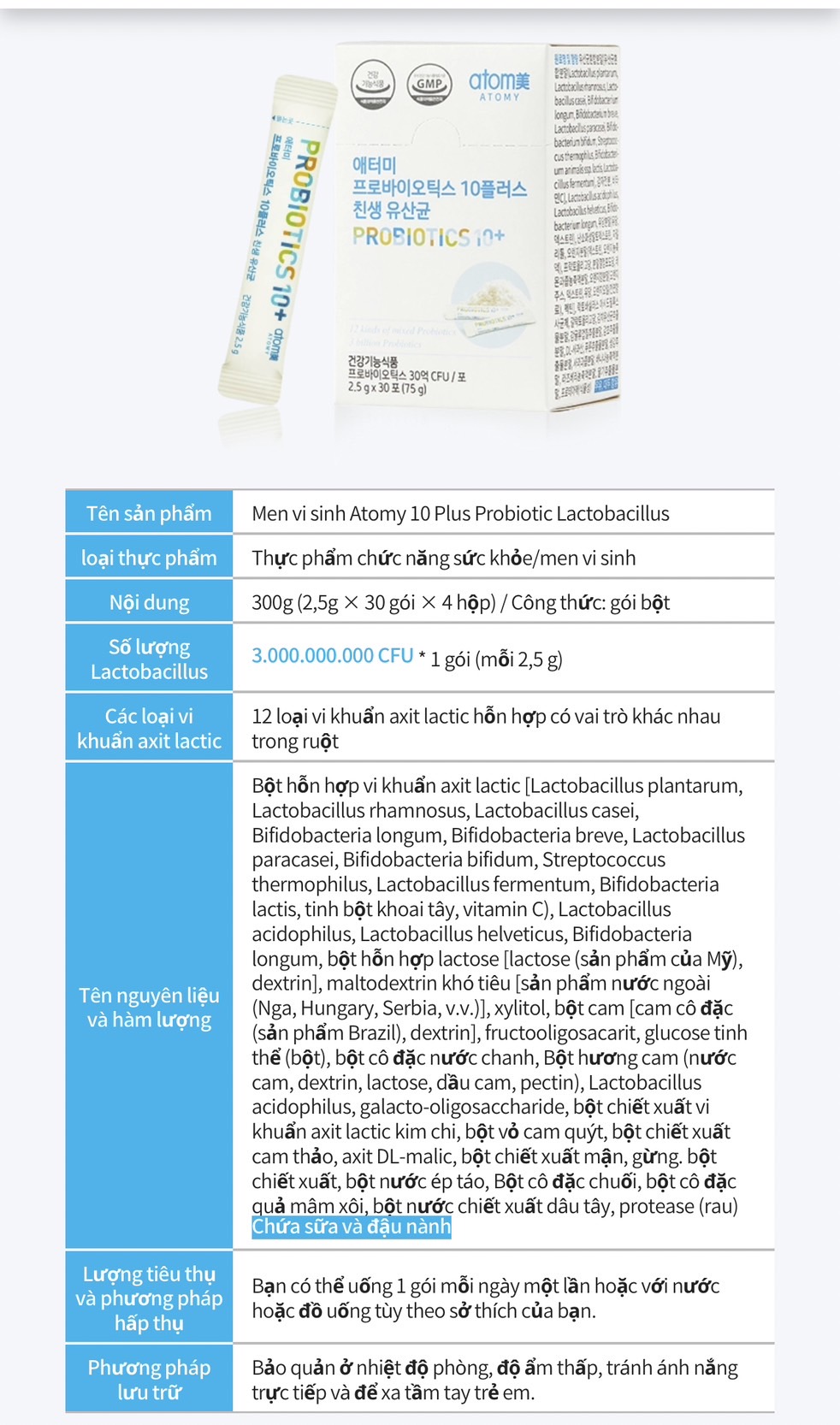 - Atomy Probiotics 10+ Plus chứa hơn 3 tỷ vi khuẩn Lactobacillus trong mỗi gói , Lactobacillus là loại vi khuẩn có lợi cho sức khỏe con người.