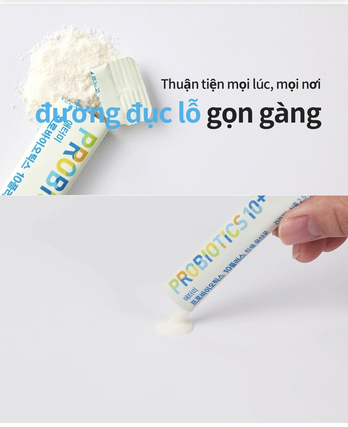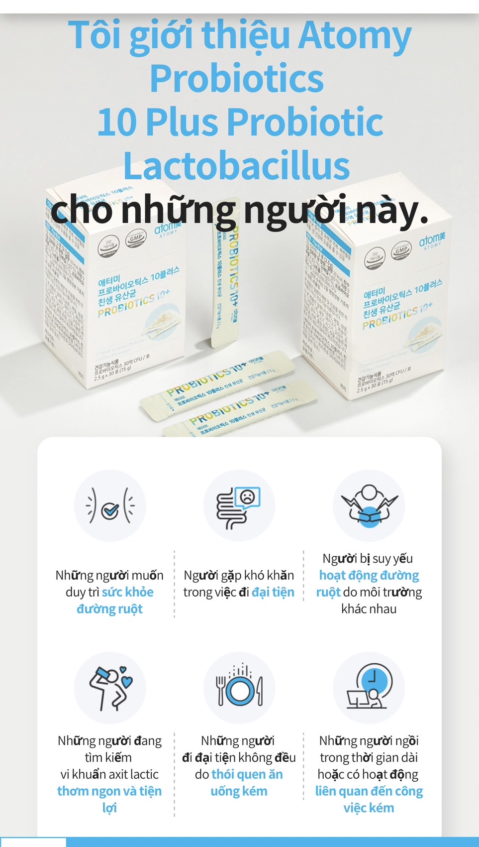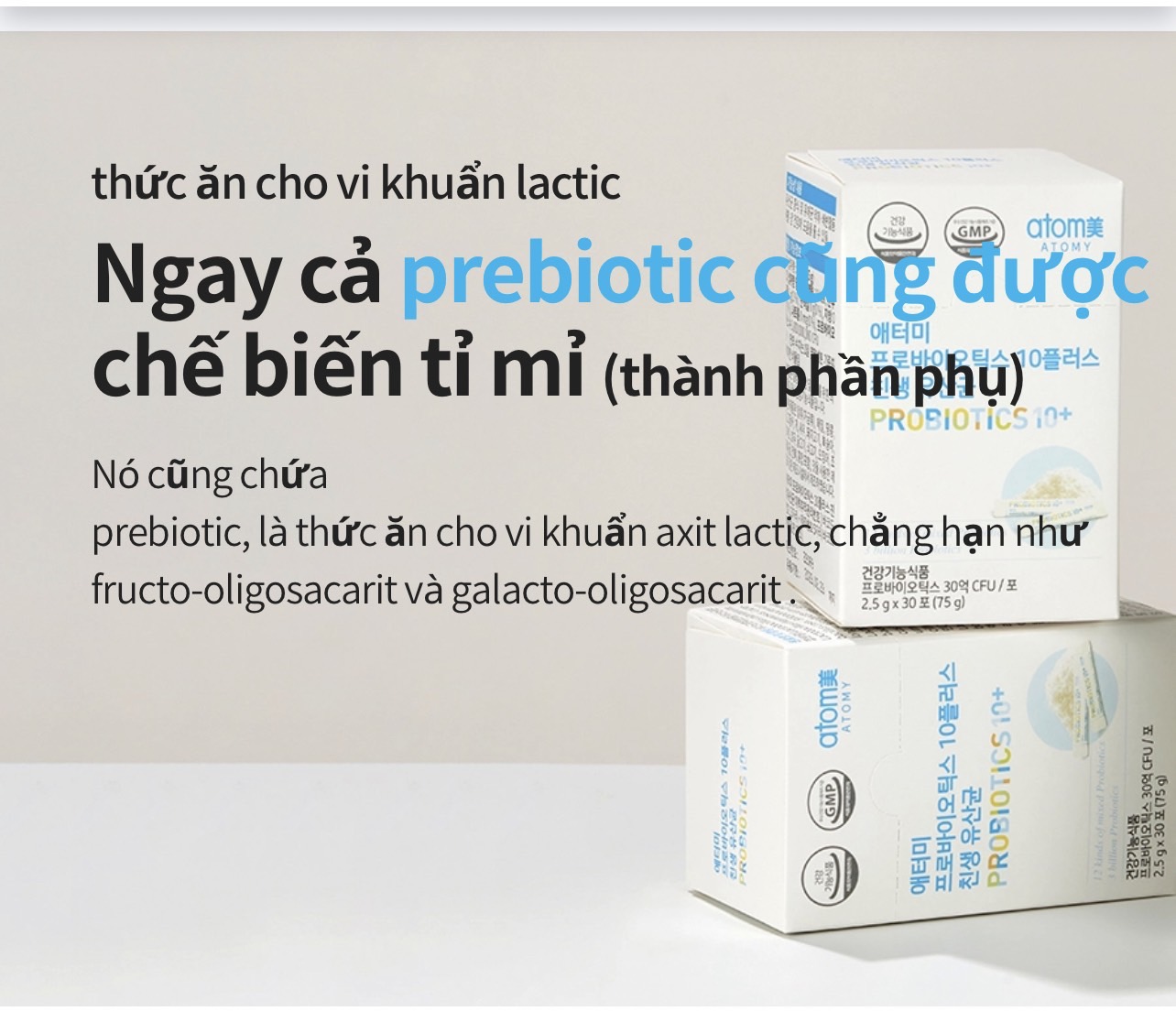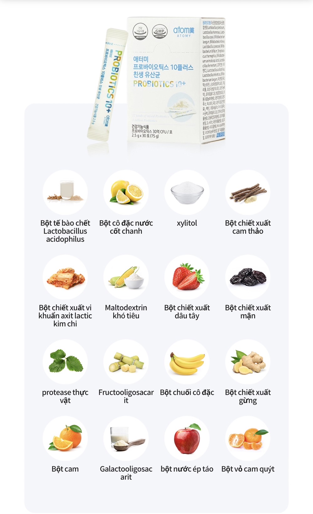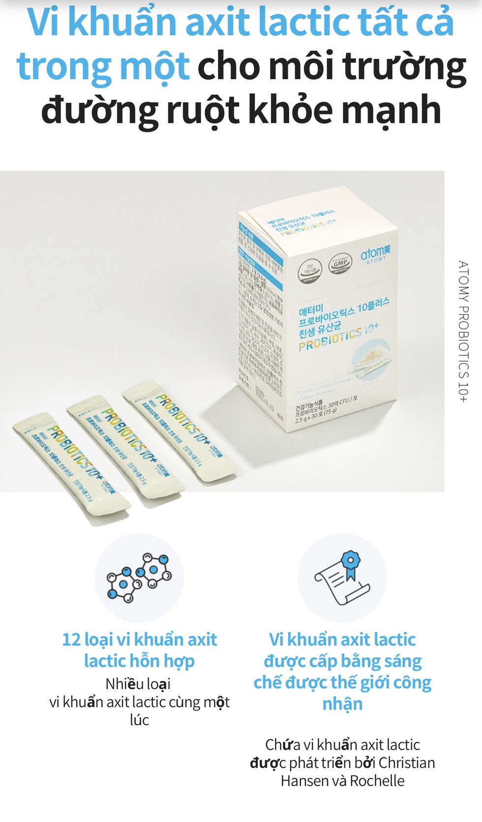 - Atomy Probiotics 10+ Plus chứa hơn 3 tỷ vi khuẩn Lactobacillus trong mỗi gói , Lactobacillus là loại vi khuẩn có lợi cho sức khỏe con người.