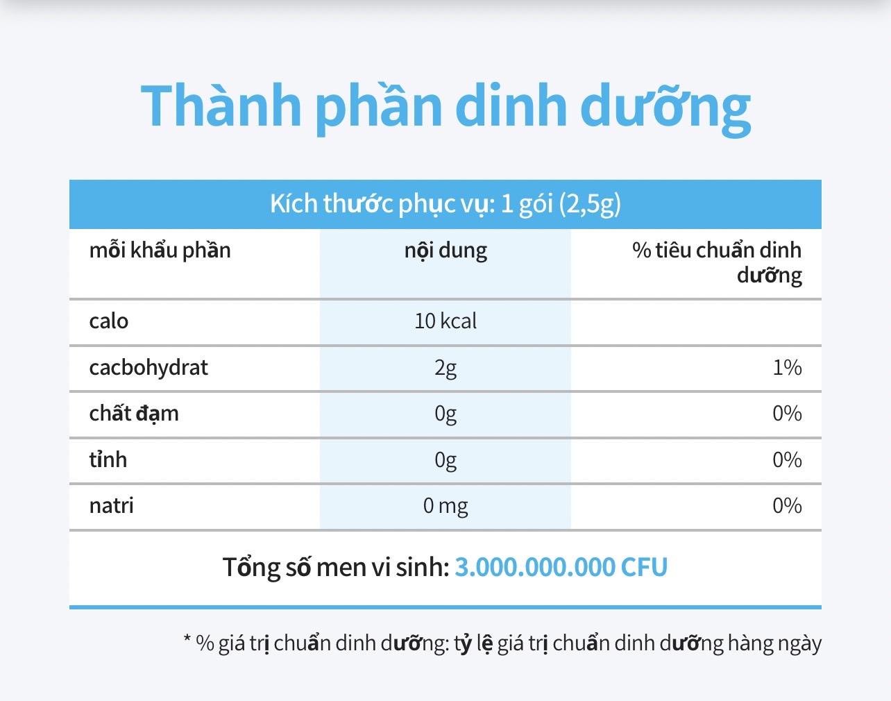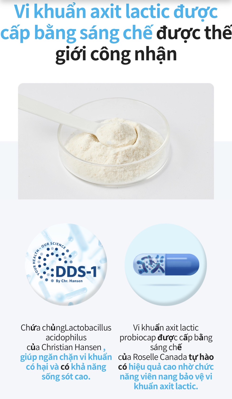 Thành phần chính bao gồm các loại vi khuẩn có lợi: Bifidobacterium Breve, Bifidobacterium Bifidum, Bifidobacterium Longum, Streptococcus Thermophilus, Lactobacillus Rhamnosus, Lactobacillus Casei, Lactobacillus Plantarum, Lactobacillus Acidophilus, Lactobacillus Paracasei, Lactobacillus Fermentum.