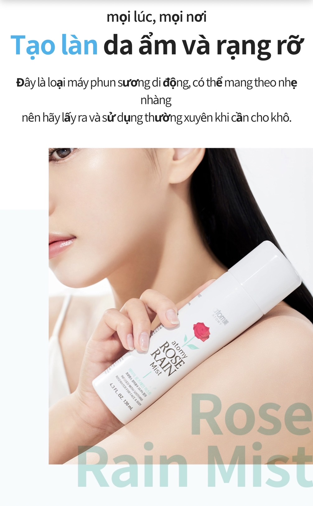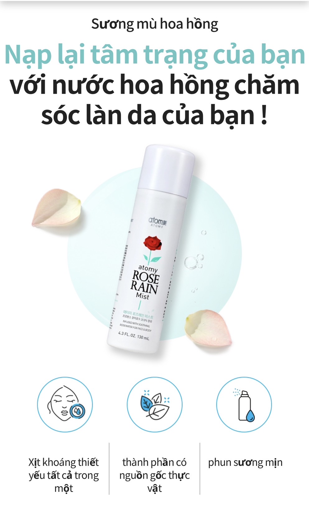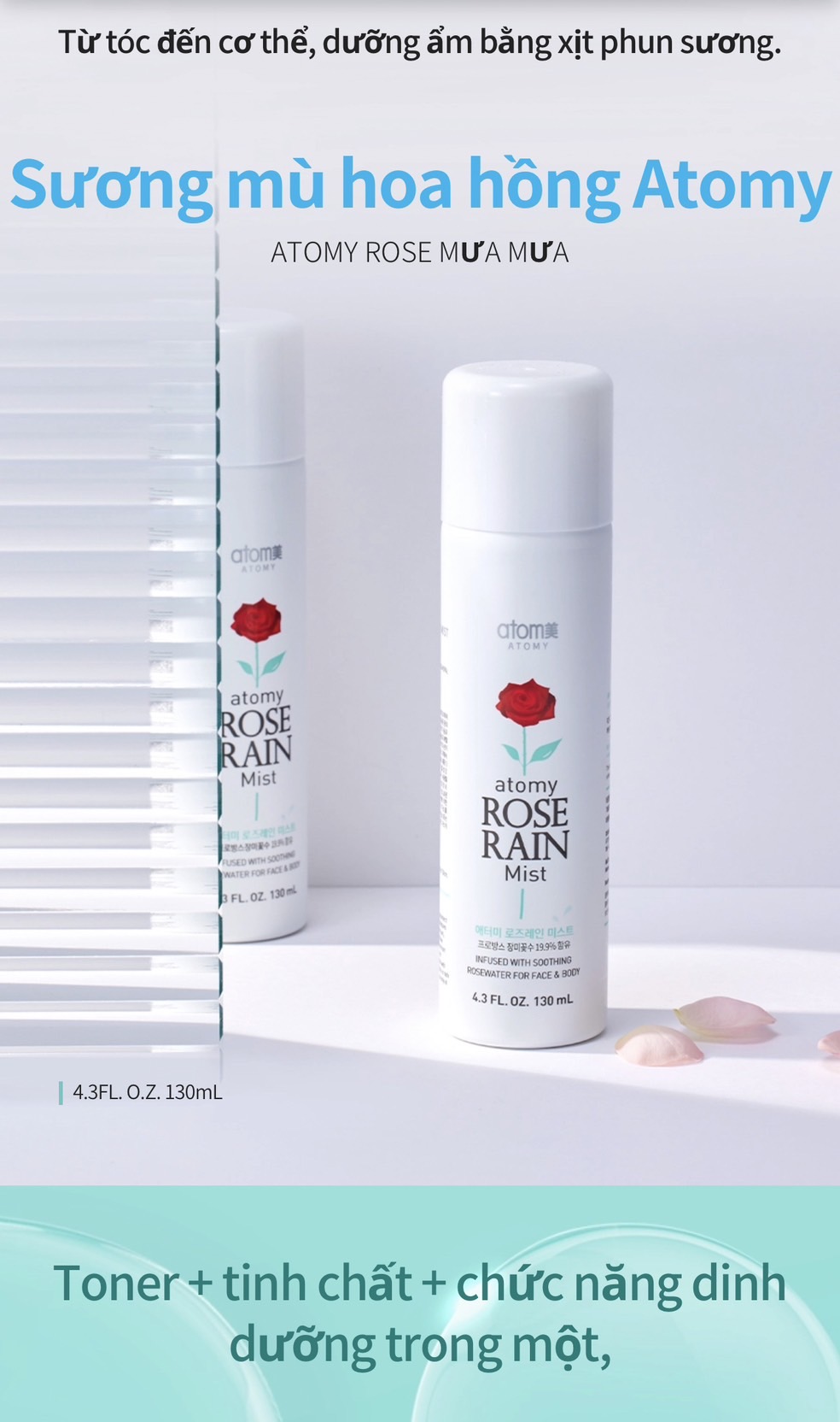 - Atomy Rose Rain Mist cũng có thể được sử dụng để chăm sóc cho mái tóc. Dưỡng chất phong phú sẽ giúp làm mềm mượt mái tóc nhiều hơn bạn mong đợi.