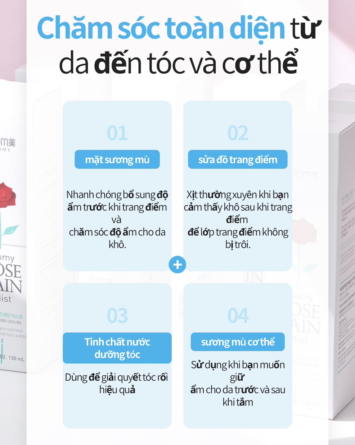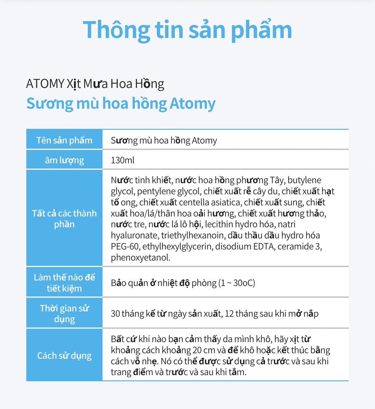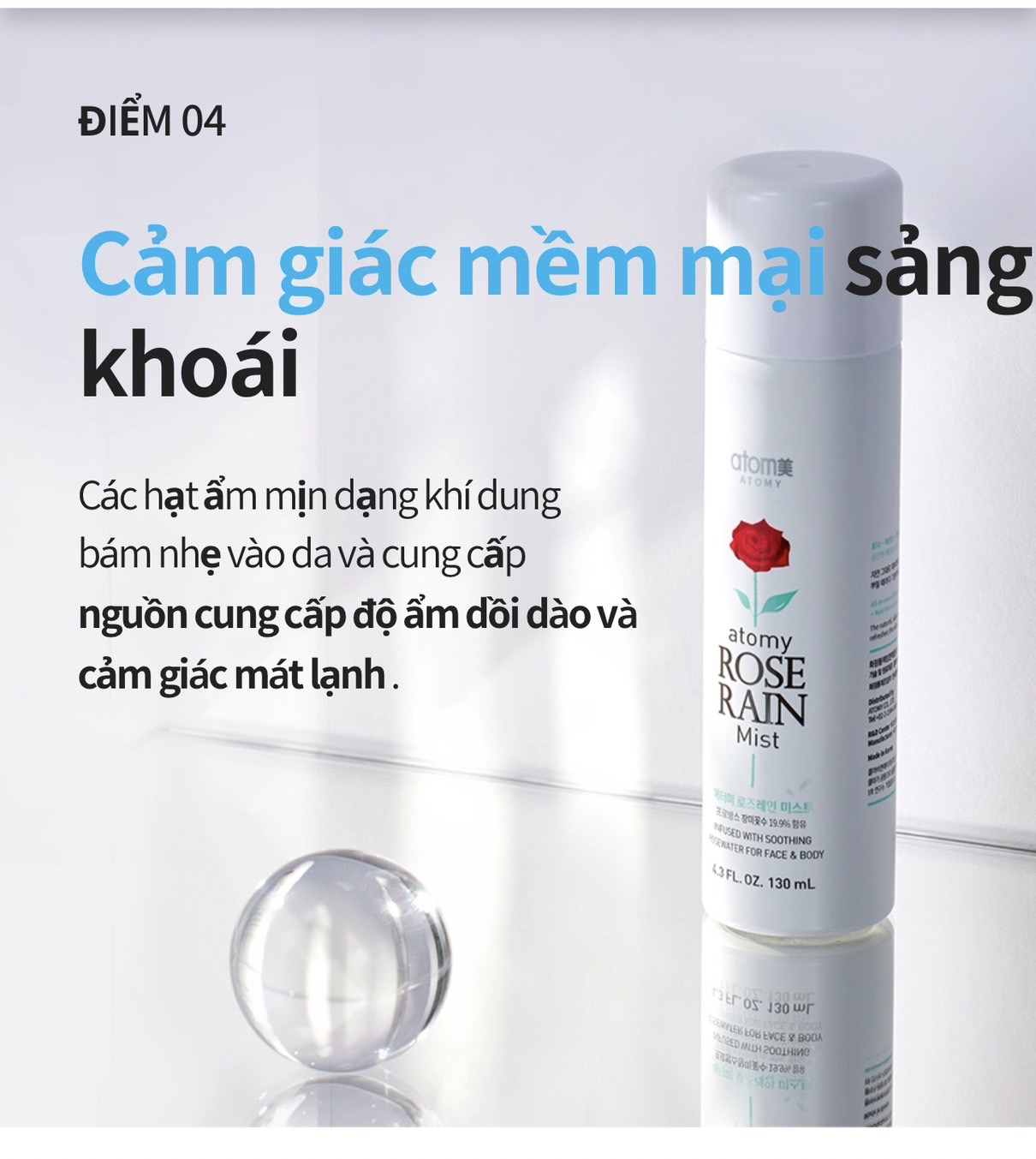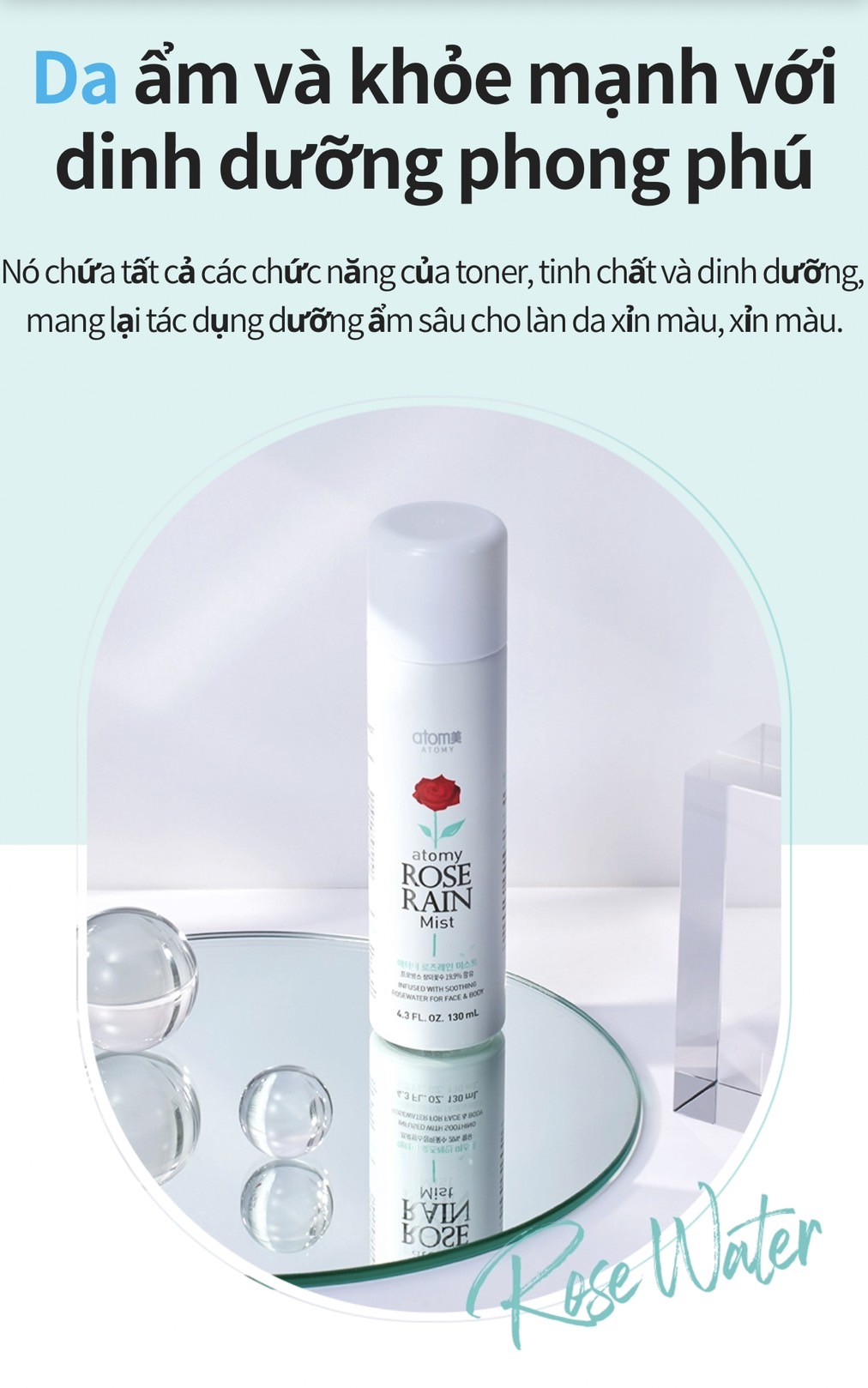 - Atomy Rose Rain Mist cũng có thể được sử dụng để chăm sóc cho mái tóc. Dưỡng chất phong phú sẽ giúp làm mềm mượt mái tóc nhiều hơn bạn mong đợi.