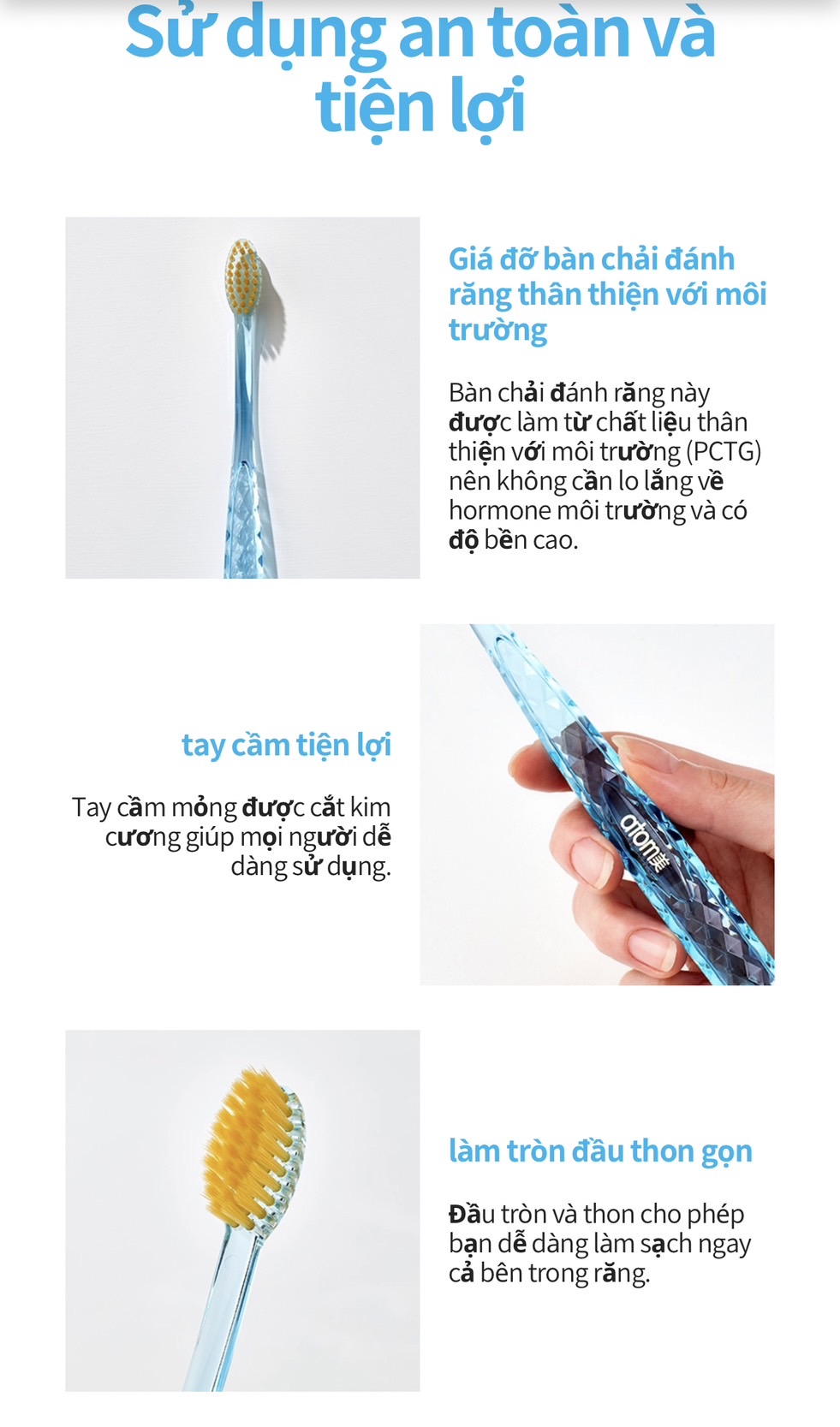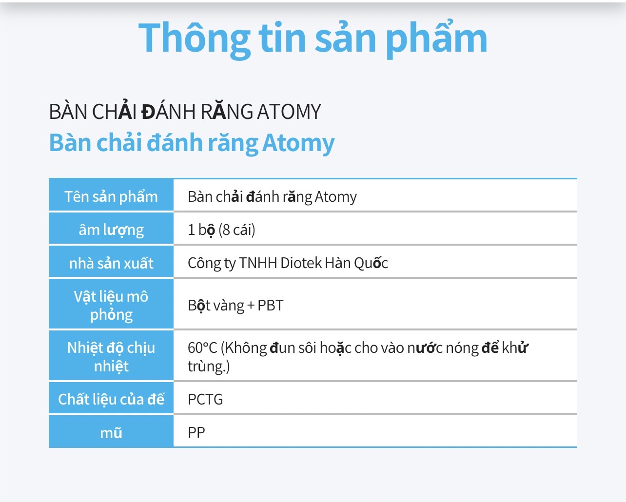 - Bàn chải đánh răng của Atomy được thiết kế bởi công ty Deo Tech rất đặt biệt có độ dày chân là 0.18mm, ở ngọn là 0.03mm siêu mỏng và phần thân nhựa dẻo cao cấp. Đảm bảo độ mềm mại , linh hoạt bằng những sợi lông chải siêu mềm mỏng sẽ len sâu vào các kẽ chân răng.