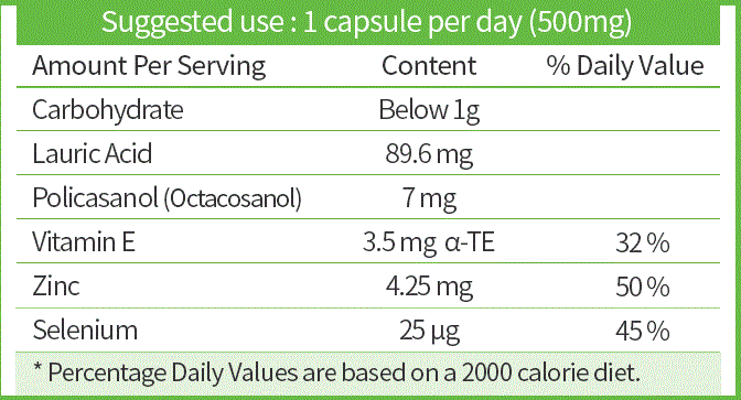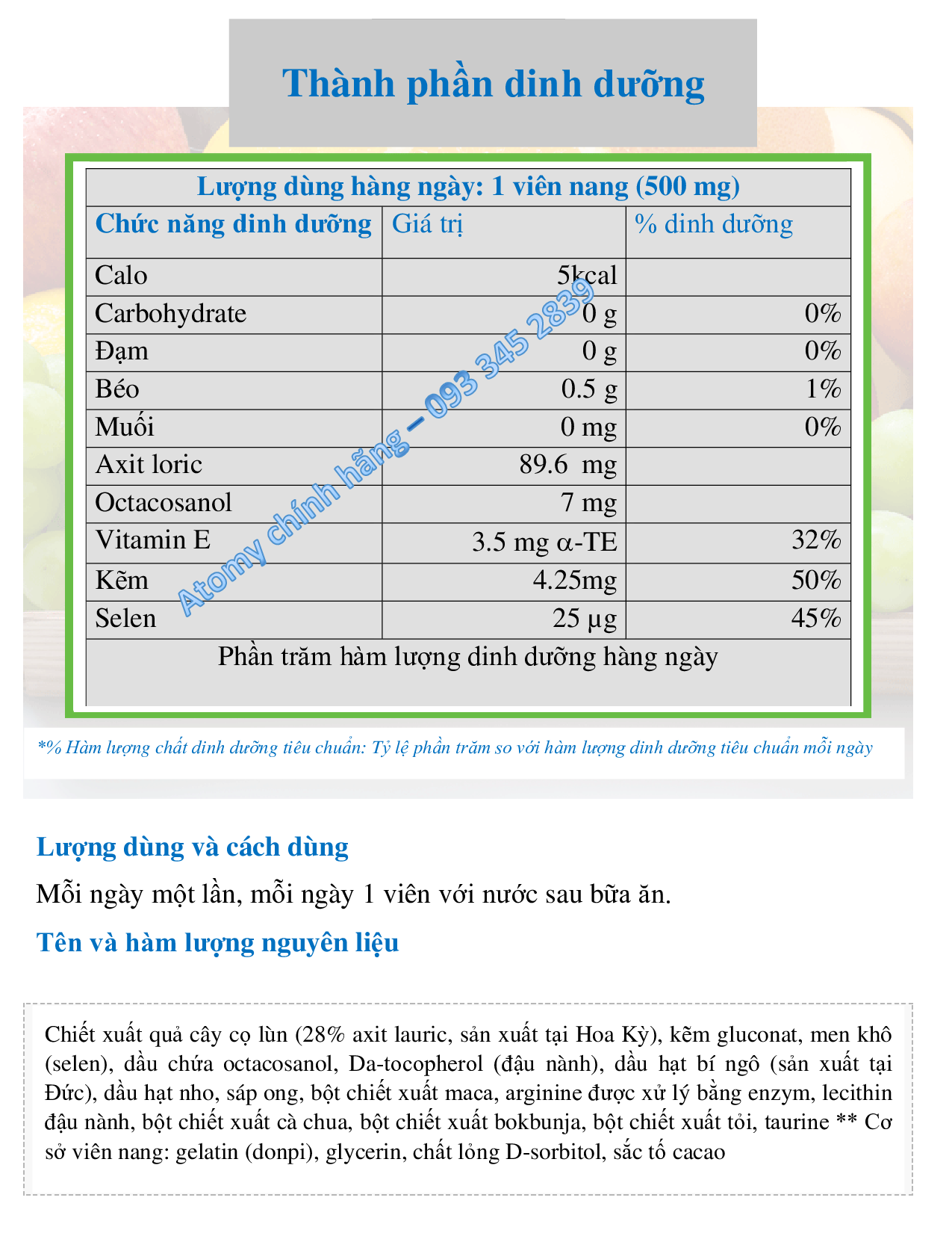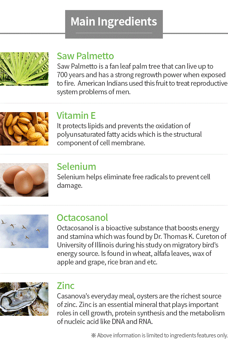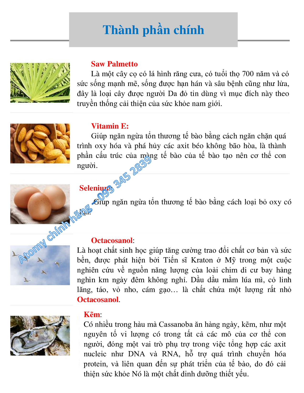 Thành phần: Cây cọ lùn Bắc Mỹ (Saw Palmetto), Octacosanol từ thực vật, Khoáng chất Selenium thực vật, Muối kẽm Zinc Gluconate, Vitamin E từ dầu đậu nành, Dầu hạt bí ngô (Đức), Dầu hạt nho (Grapeseed Oil), Sáp ong (Beeswax), Chiết xuất củ maca (Peru), Axit amin Arginine, Mầm đậu nành (Soybean Lecithin), Cà chua (Tomato), Qủa mâm xôi đen Hàn Quốc (Rubus coreanus), Tinh chất tỏi (Garlic).