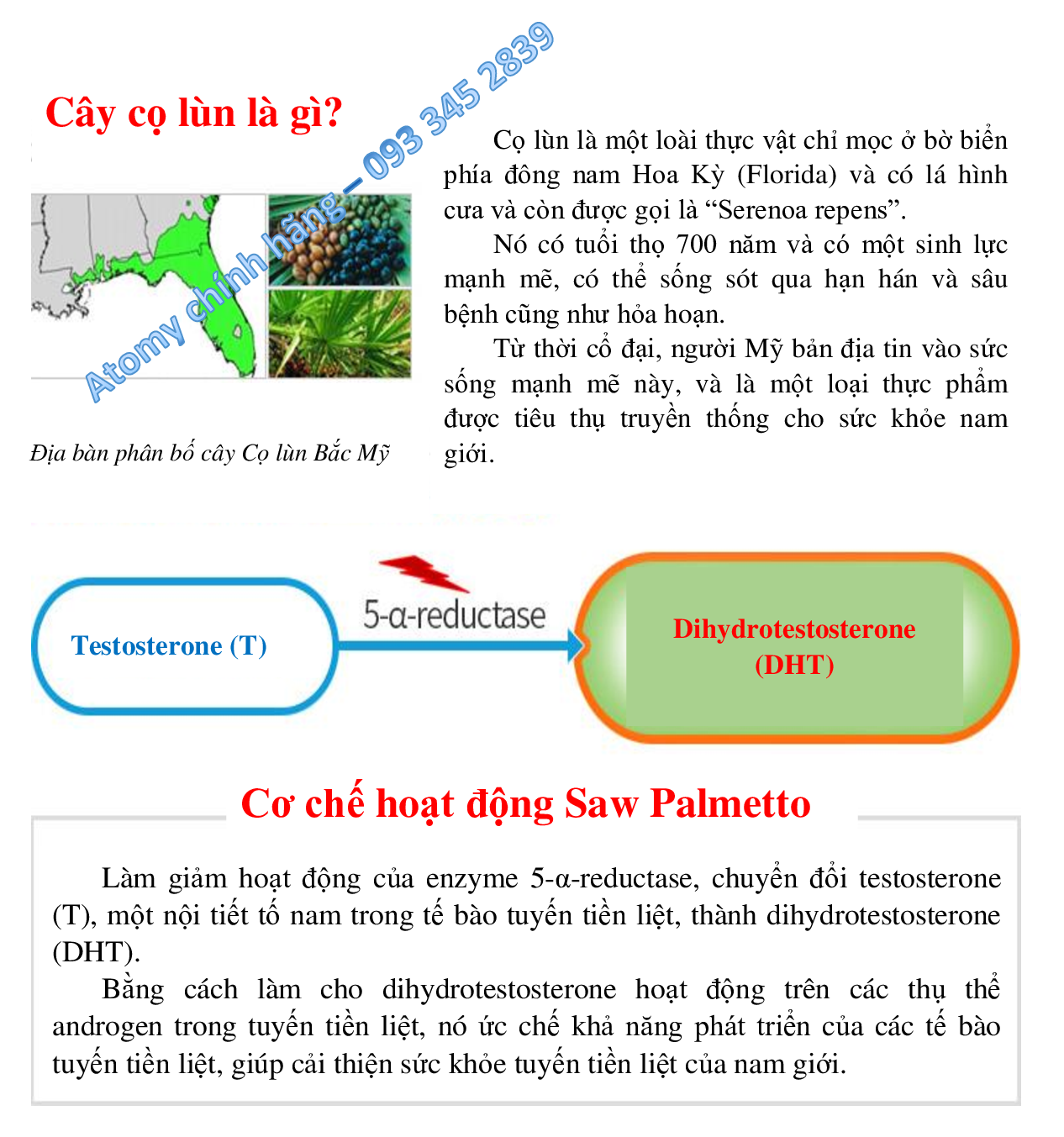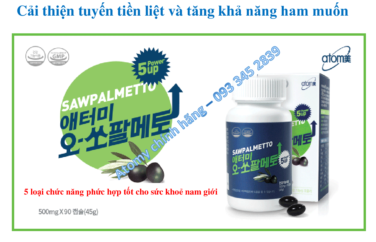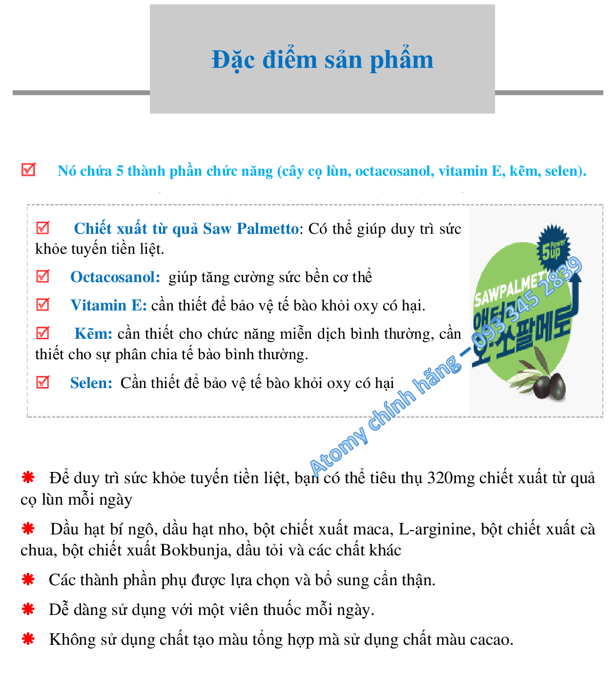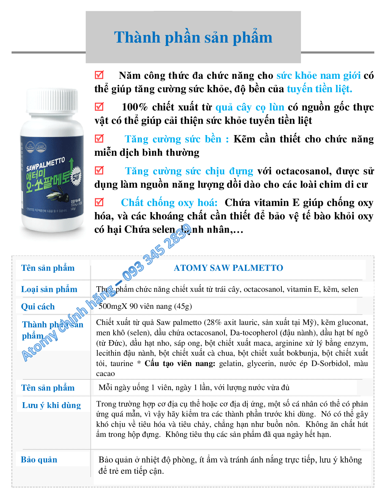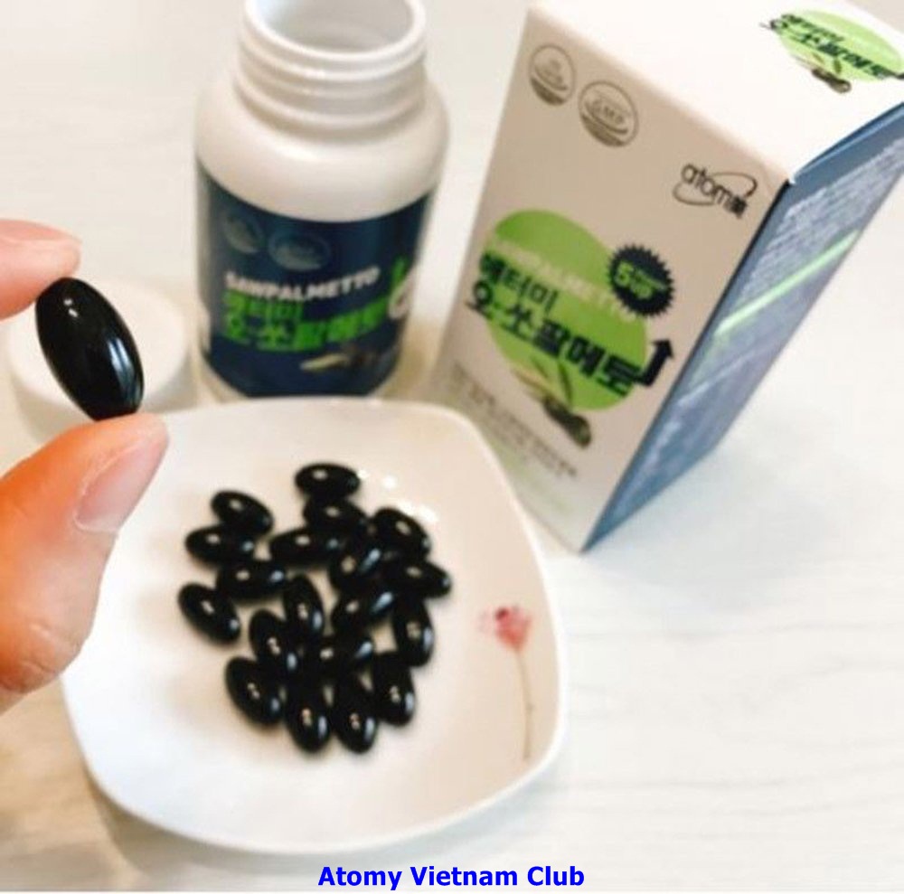 - Atomy Saw Palmetto được chiết xuất từ cây cọ lùn Bắc Mỹ, có thành phần gồm lipid, axit béo, Phytosterol, Flavonoids và Polysaccharide, những chất này có vai trò quan trọng trong việc chống co thắt, chống viêm sưng, lợi tiểu và đặc biệt có thể giúp điều trị phì tiền liệt tuyến.