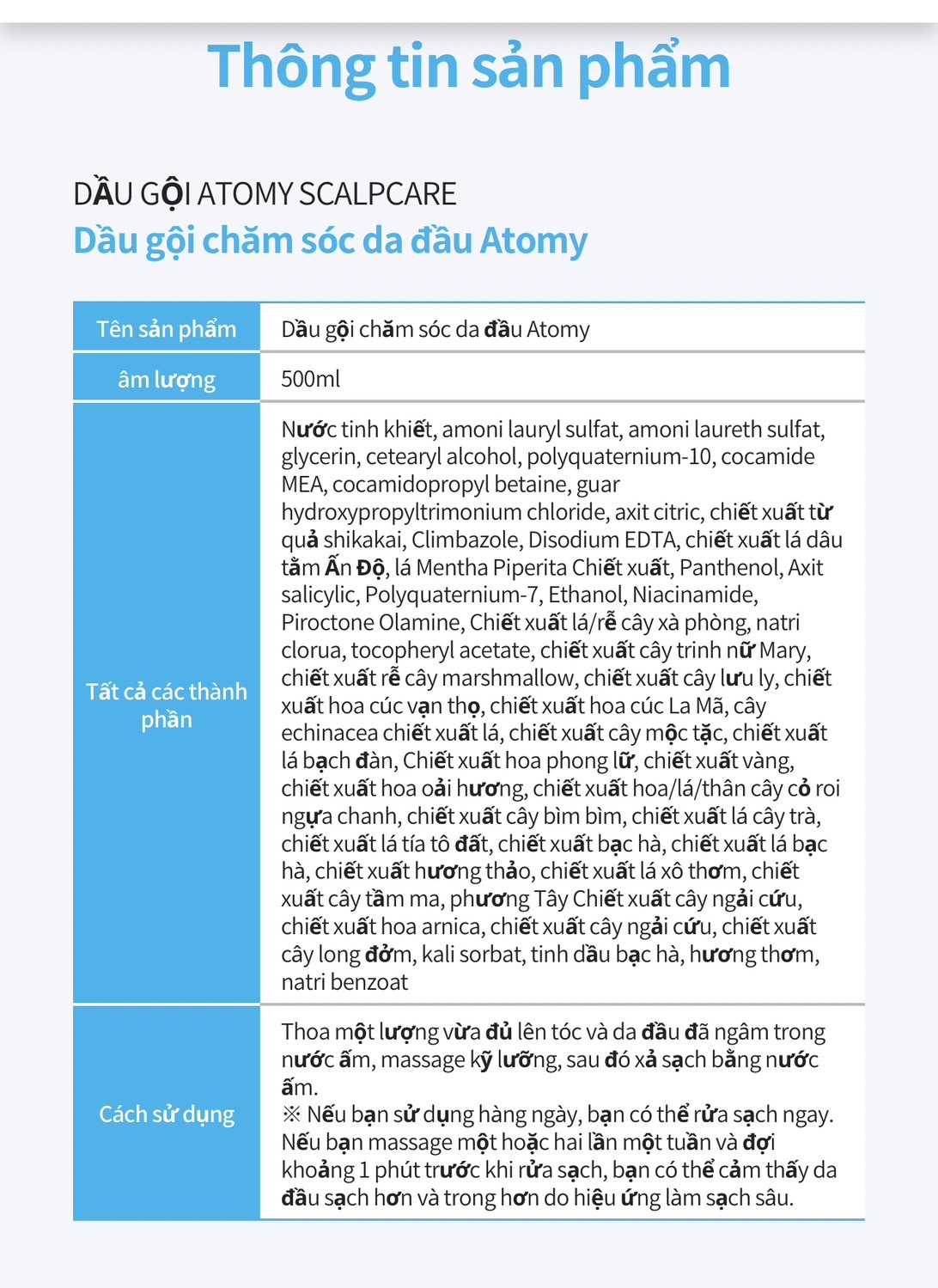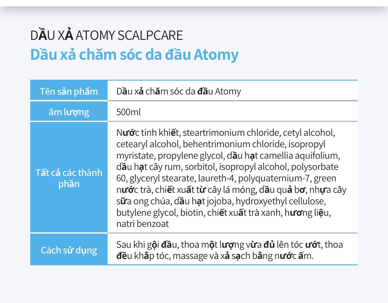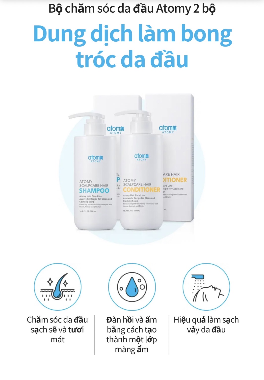 - Kết hợp với dầu gội ATOMY SCALPCARE SHAMPOO để đạt hiệu quả cao nhất trong việc điều trị gàu mãn tính , gàu lâu năm, nấm da đầu , ngứa da đầu và triệu chứng gãy rụng & trẻ ngọn .