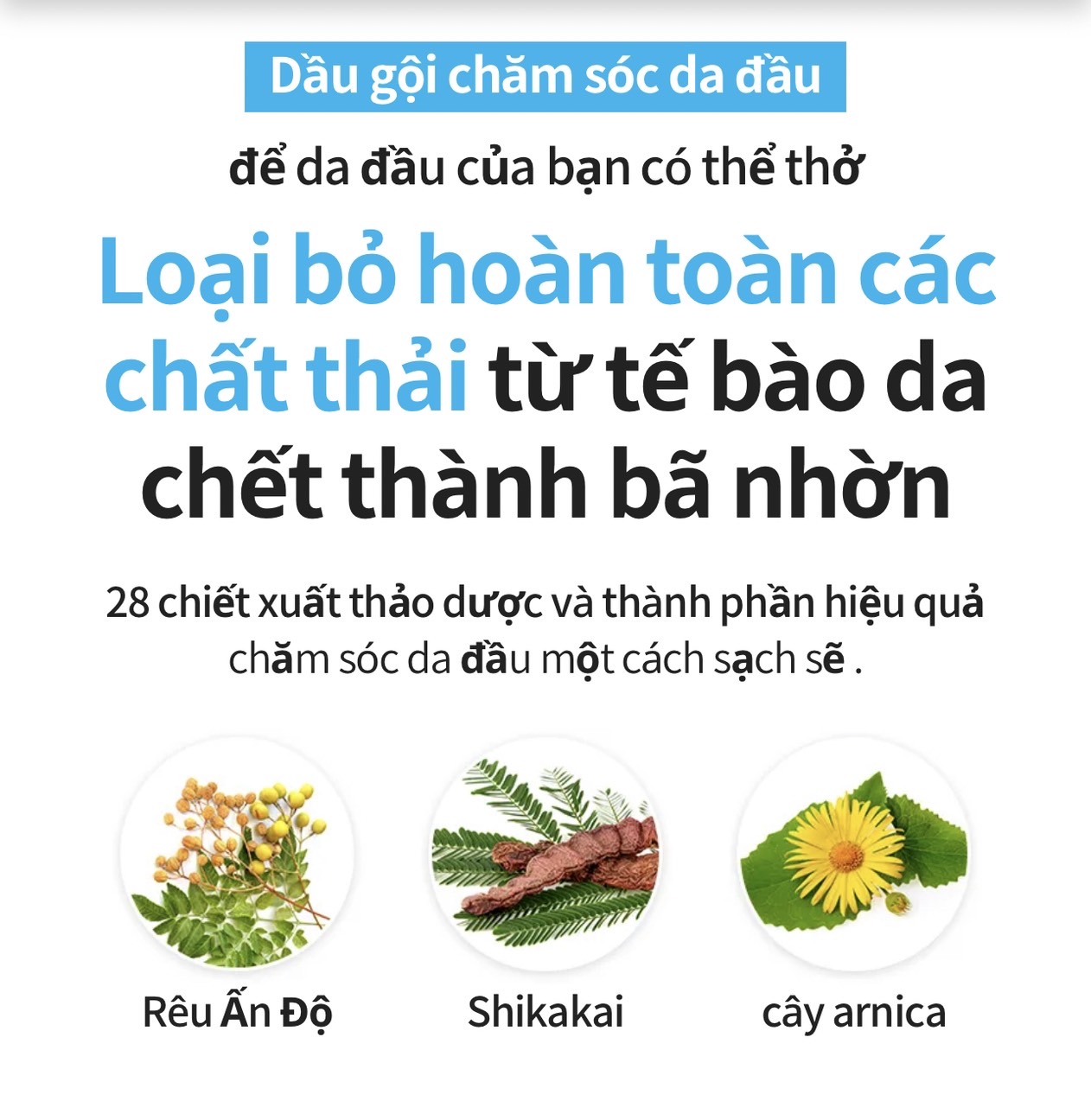 - Làm sạch và nuôi dưỡng da đầu với sự kết hợp các dưỡng chất từ Lá Sầu đâu, Cúc Arnica, Keo lá me…