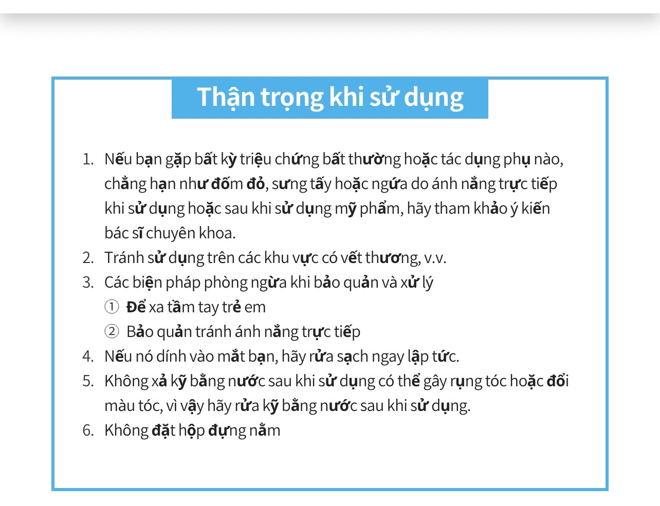 - Chỉ sử dụng ngoài da, tránh vào mắt. Trường hợp, bị chảy vào mắt thì rữa sạch bằng -nước ấm.