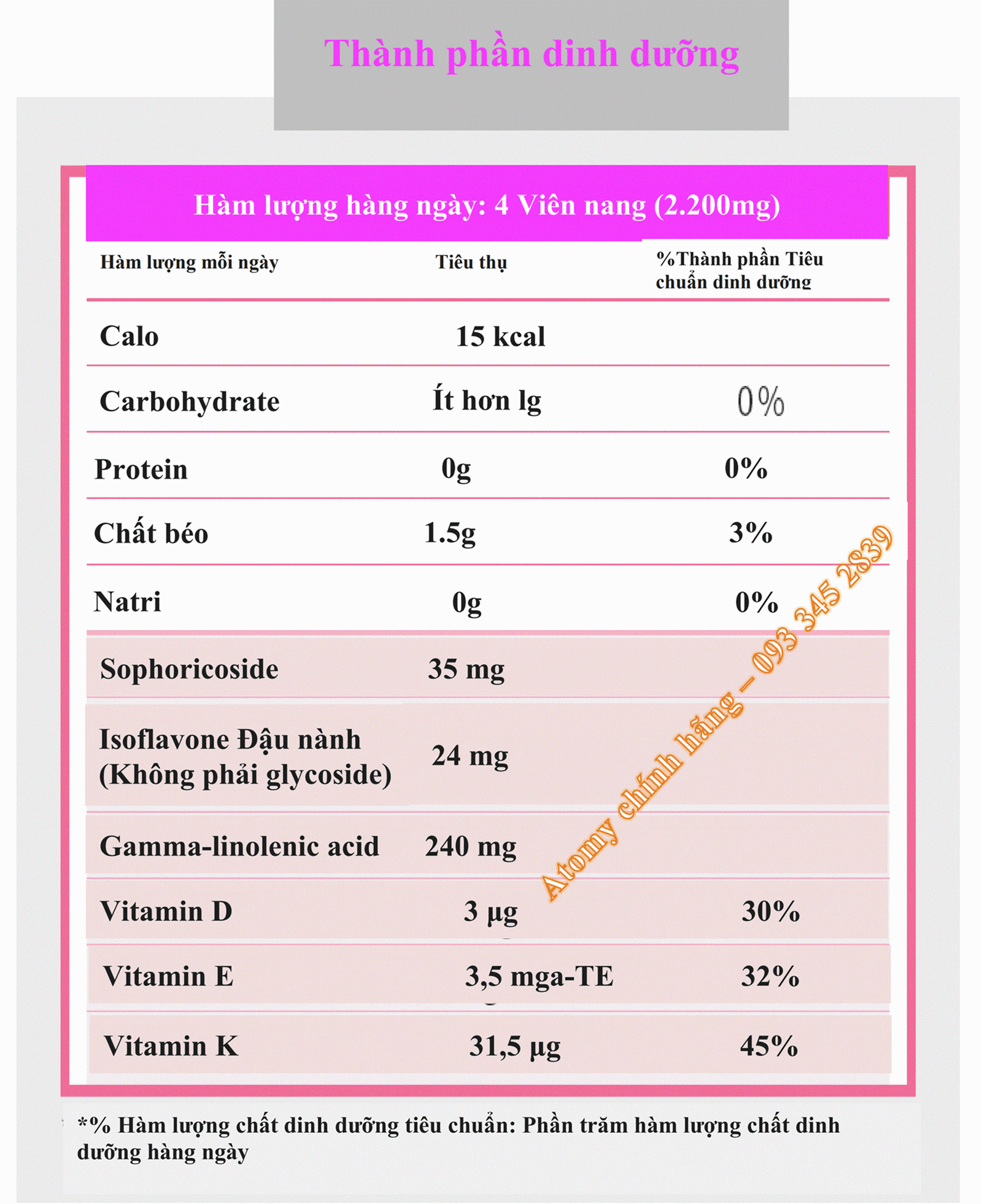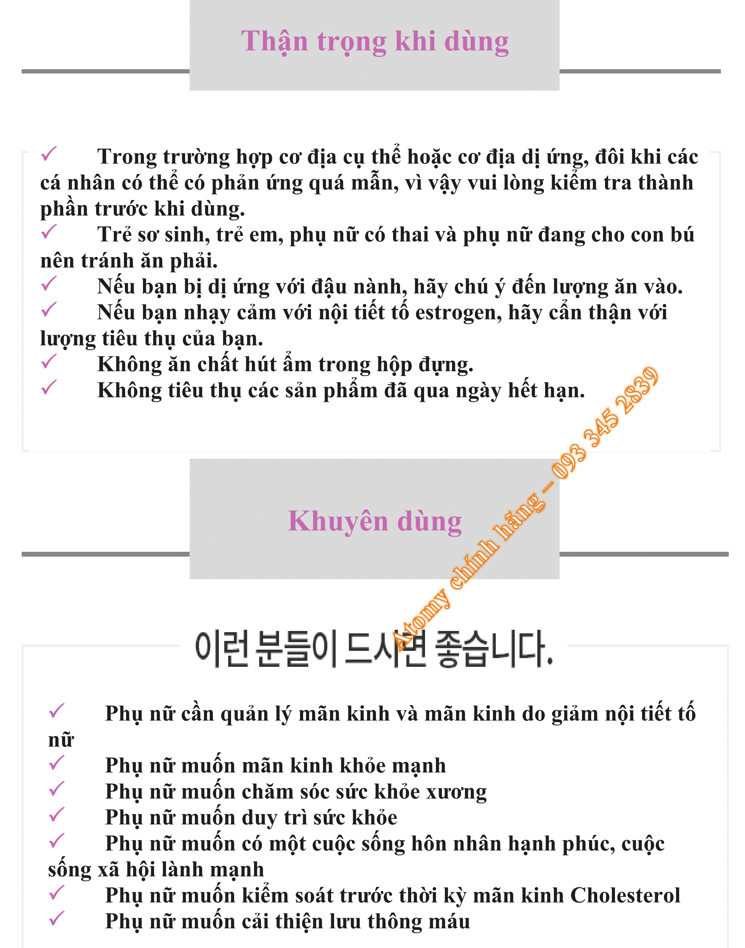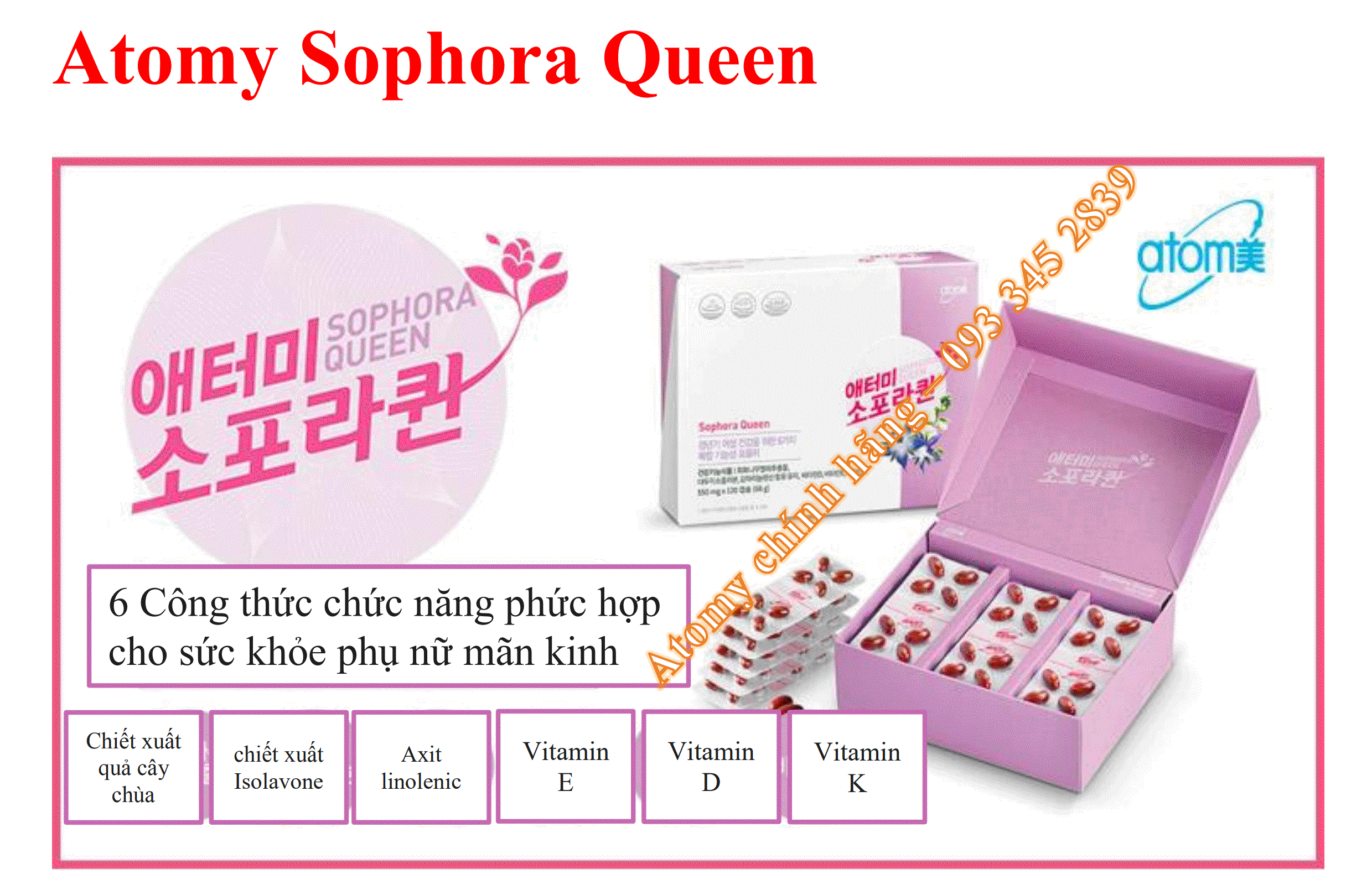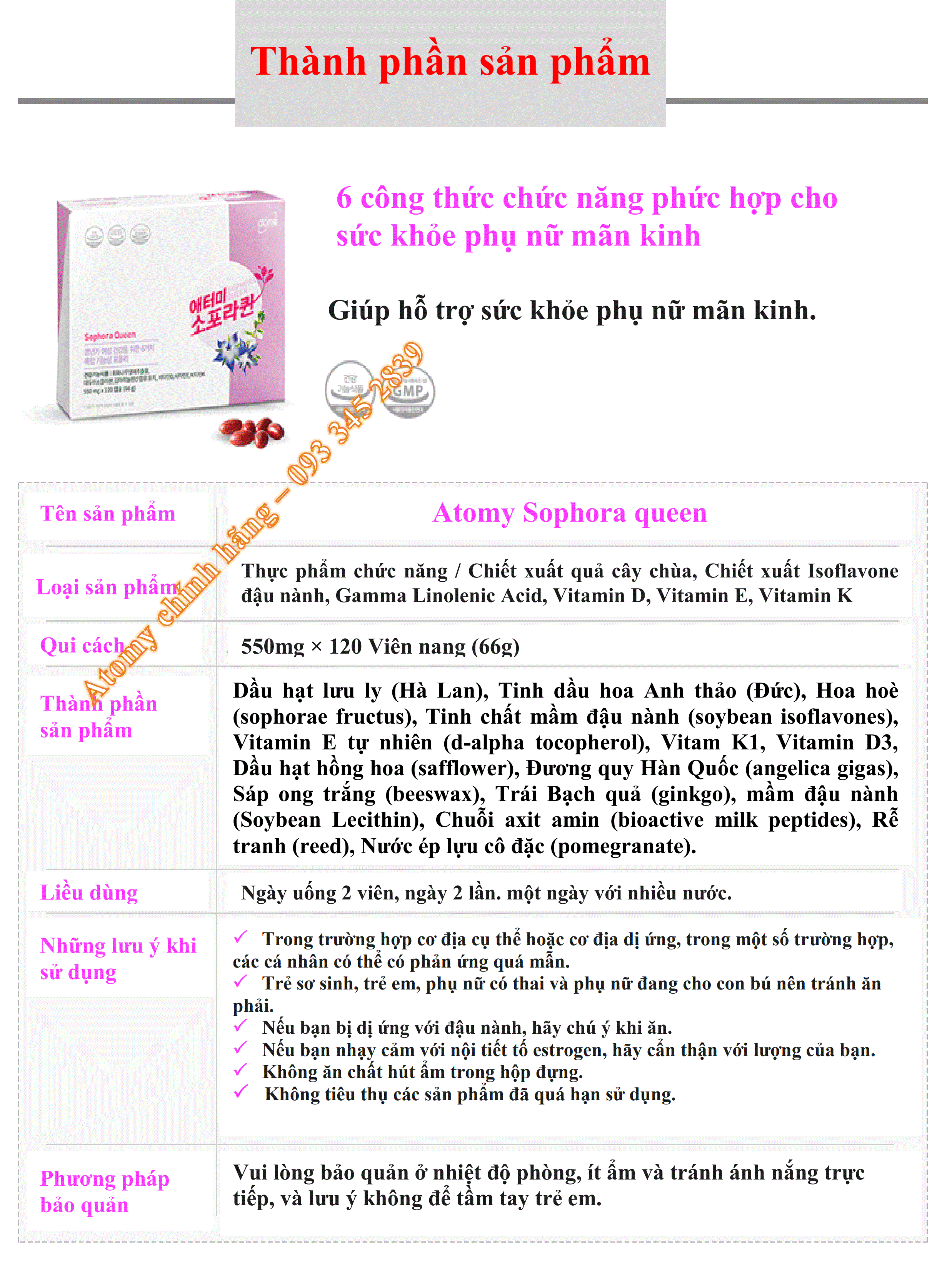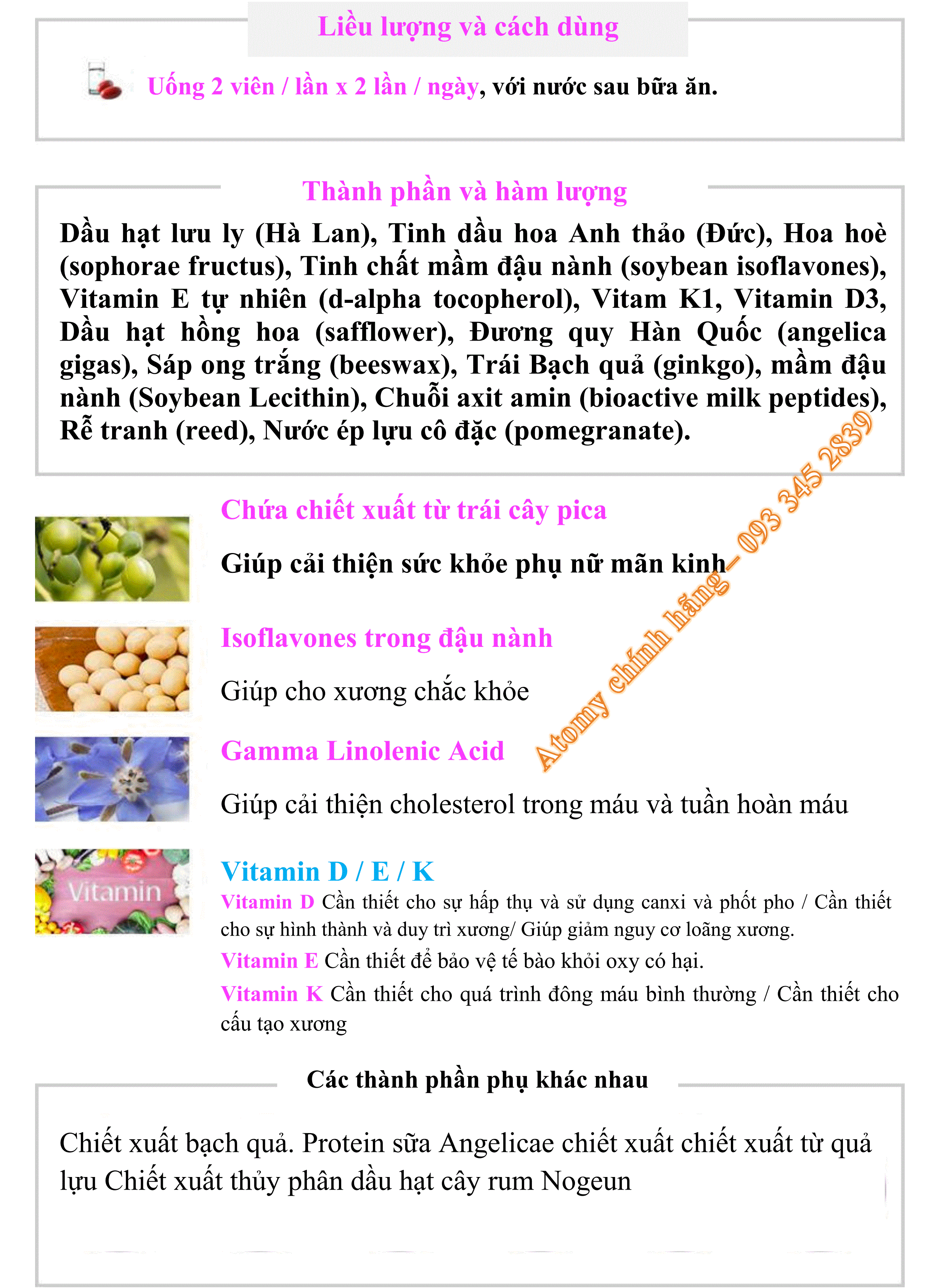 Sản phẩm dành riêng cho phụ nữ trong độ tuổi 40~60 mãn kinh & tiền mãn kinh thường hay xuất hiện các triệu chứng như hay cảm thấy khó chịu , đau đầu, rối loạn nhịp tim ,các cơ khớp nhức mỏi , mất ngủ, chóng mặt , hay mệt mỏi đổ mồ hôi... biểu hiện của tuổi già. Giúp cải thiện lưu thông máu, làm giảm lượng cholesterol trong máu, chắc xương, axit gamma-linolenic với 6 loại khoáng chất, chất isoflavones có trong đậu nành, được chiết xuất từ hoa hòe với công thức đặc biệt có khả năng tổng hợp 6 loại dành cho sức khỏe nữ giới thời kỳ mãn kinh.