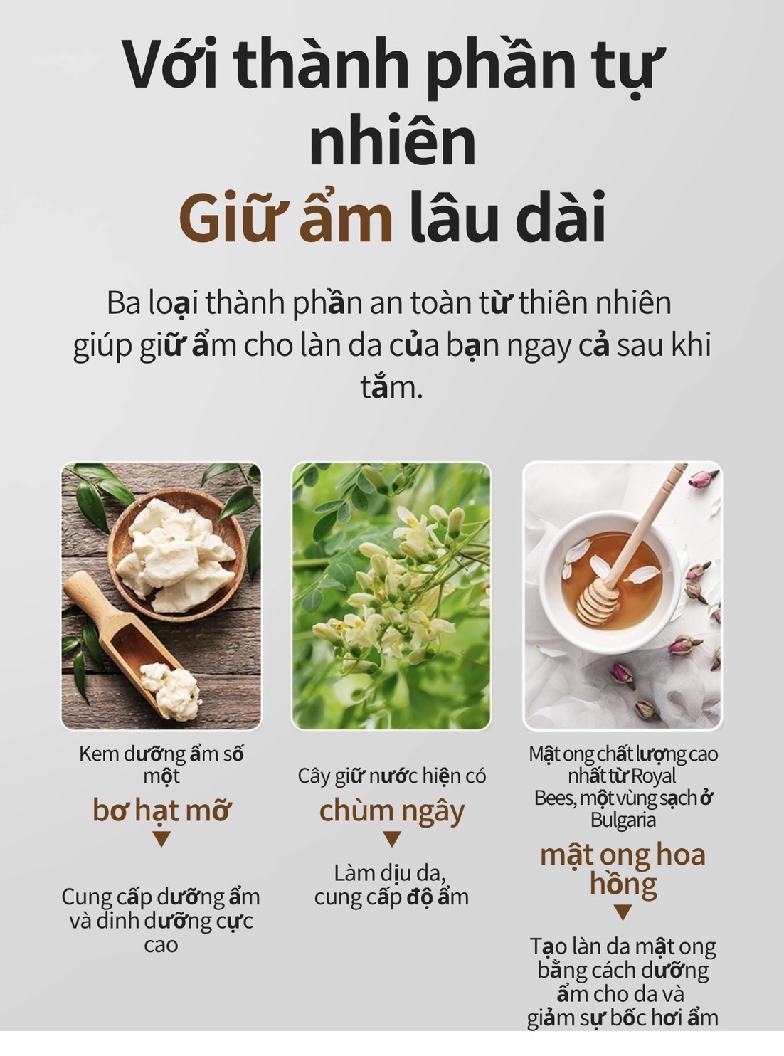 Thành phần: Bơ hạt mỡ (Shea Butter), Mật ong (Honey), Hoa chem ngây (Moringa)…