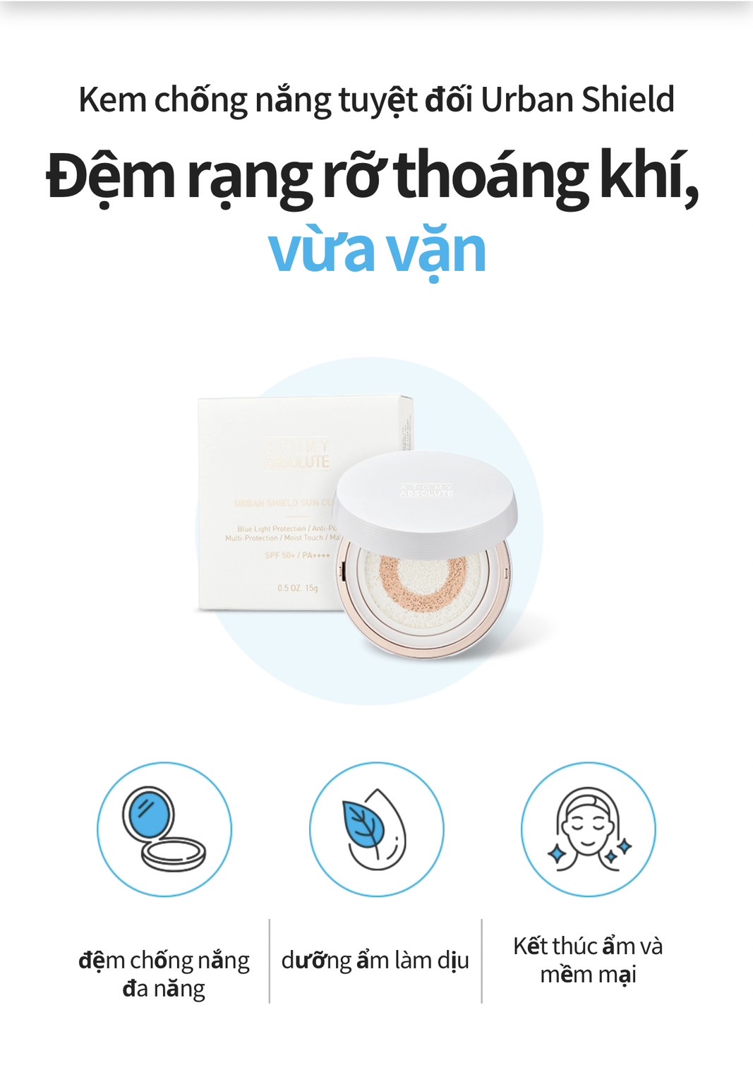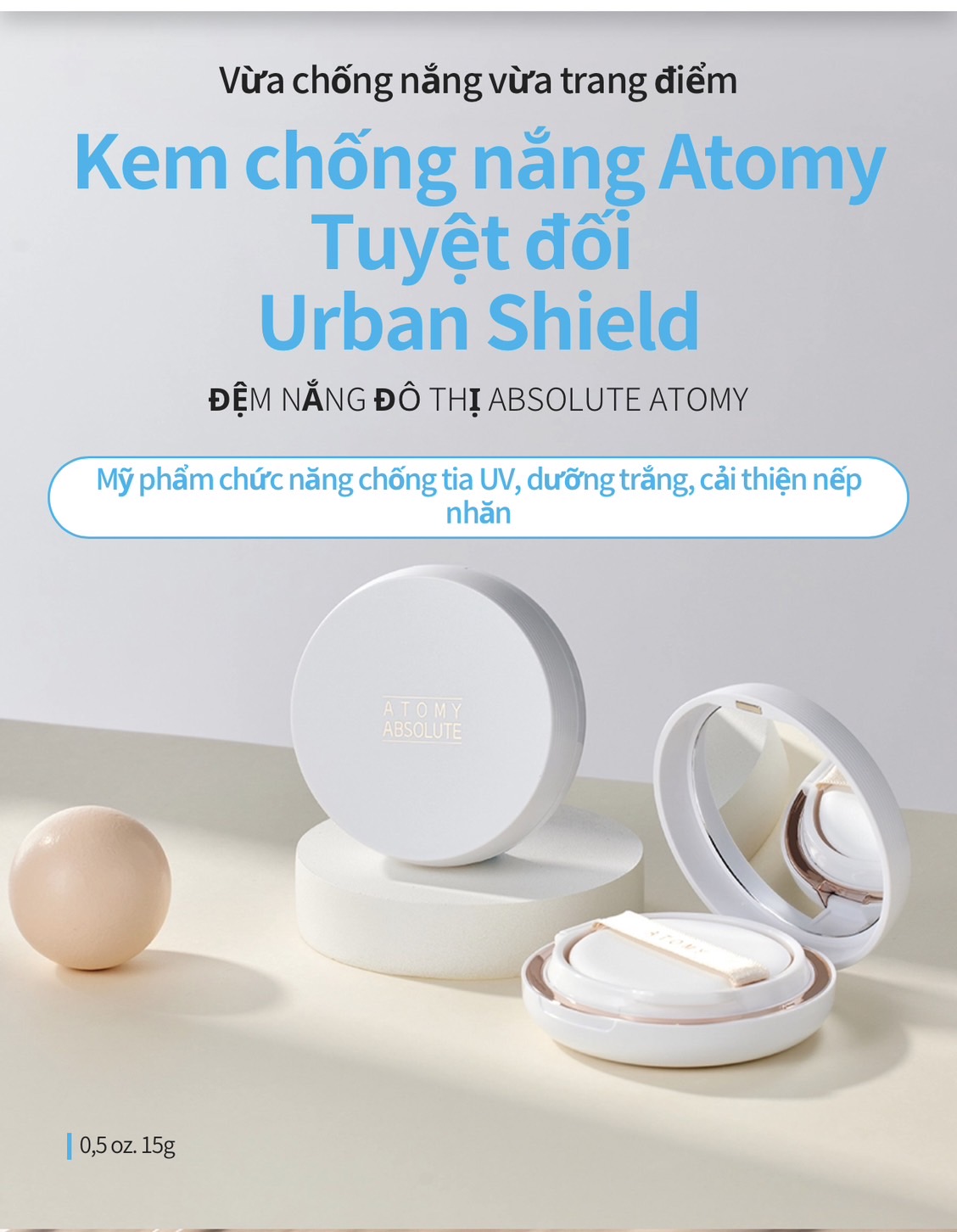 Phấn chống nắng và trang điểm cùng lúc chống tia cực tím cao SPF 50+ PA++++ và ánh sáng xanh từ thiết bị điện tử cùng khả năng làm trắng và cải thiện nếp nhăn vượt trội (15g)Atomy Urban Shield Sun Cushion - 앱솔루트 어반 쉴드 선쿠션 - Атоми Абсолют Солнцезащитный Кушон
