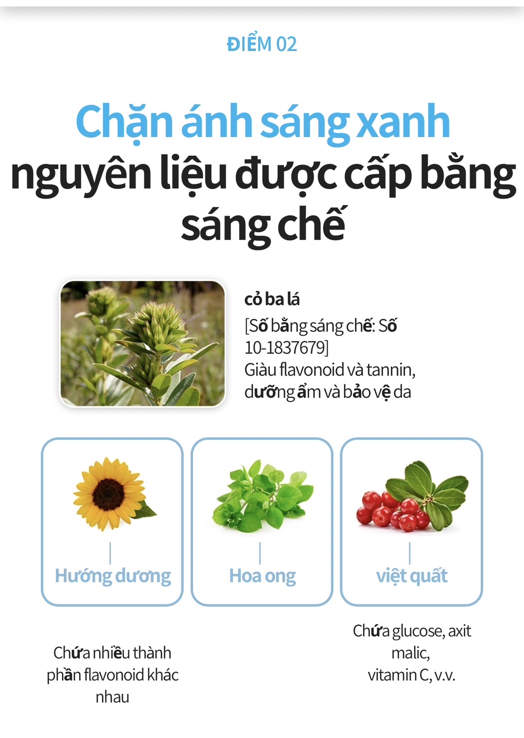 💥💥 Công nghệ B-CircadinTM - chiết xuất từ cây Bucyclovir giúp chống lại ánh sáng xanh và ánh sáng sinh học.