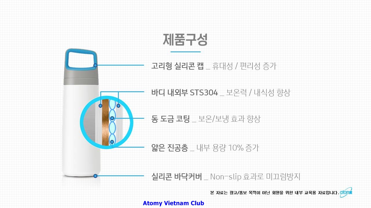 Bình giữ nhiệt Atomy được thiết kế 3 lớp: 2 lớp trong và ngoài được làm bằng thép không gỉ ST304. Chính giữa là lớp cách nhiệt giúp giữ nhiệt độ từ -20o C đến 120o C trong nhiều giờ.
