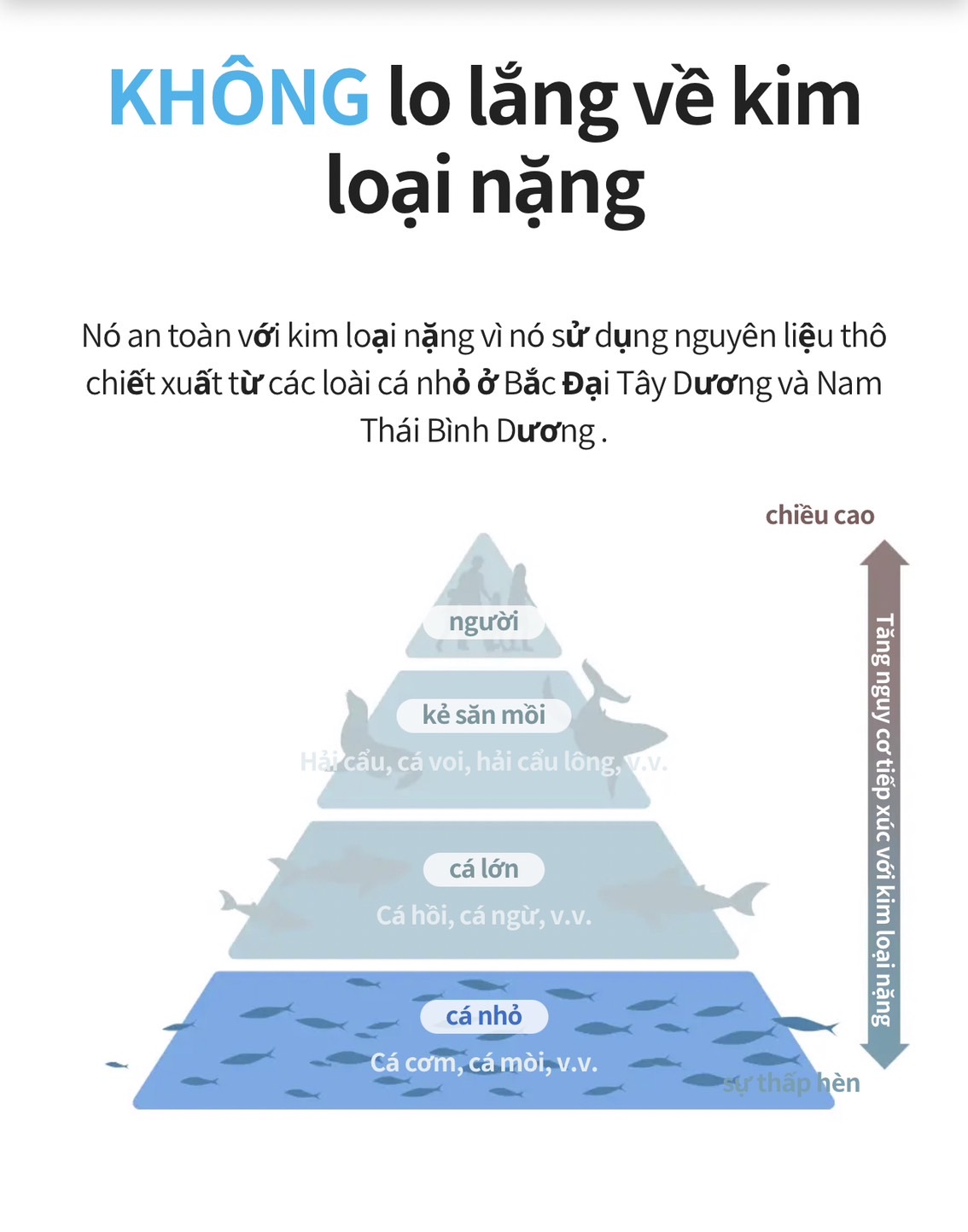 + Nguyên liệu được đánh bắt từ các loài cá tự nhiên sống ở vùng biển Bắc Đại Tây Dương và Nam Thái Bình Dương từ các loài cá nhỏ giàu omega-3, DHA, EPA.
