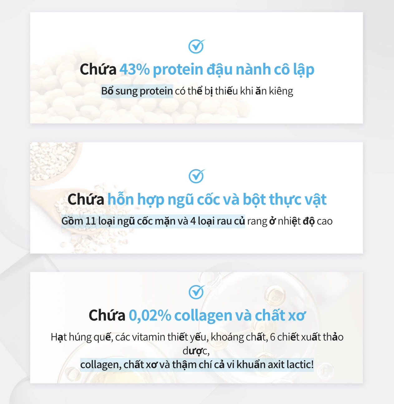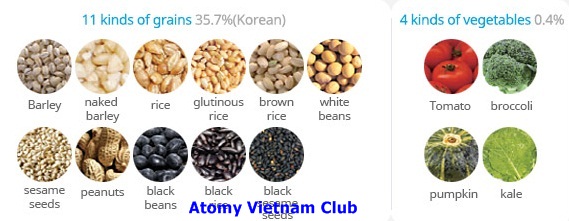 Thành phần: Protein đậu nành chiếm 43% (trồng tại Canada được bỏ vỏ và tách chất béo) [ Các loại rau, đậu, hạt : Gạo nâu Đậu trắng, Kiều mạch, Gạo đen, Gạo nếp (Glutinous), Đậu phộng (Peanut), Hạt vừng (Sesame), Bí ngô (Pumpkin), Cải xoăn (Kale), Bông cải xanh (Broccoli), Cà chua(Tomato) đều được trồng tại Hàn Quốc], đường hữu cơ (Colombia), Sữa tách béo (Skimmed Milk), Táo tàu (Jujube), Các Vitamni tổng hợp tự nhiên (Calcium Phosphate Dibasic, Vitamin C, Vitamin E, Chiết xuất Vitamin B3, Vitamin B5, Oxit Kẽm, Vitamin A, Vitamin B1, Vitamin B6, Axid Folic) , Nước ép trái cây, hạt Húng quế (Basil), 5 loại men tiêu hoá sống (Bifidobacterium Longum, Lactobacillus Acidophilus, Lactobacillus Casei, Lactobacillus Plantarum, Streptococcus Thermophilus), lúa mì (Wheat), dầu Oliu, Bồ công anh lùn (Taraxacum Laevigatum), Hồng trà Nam Phi (Rooibos), Chanh (Lemon), Cúc La Mã (Chamomile), Bạc hà Âu (Pepermint), Củ rau diếp xoắn (Chicory), Muối Oat Bran, Mầm đậu nành, đậu phộng (Peanuts), cà chua (Tomato), Sữa.