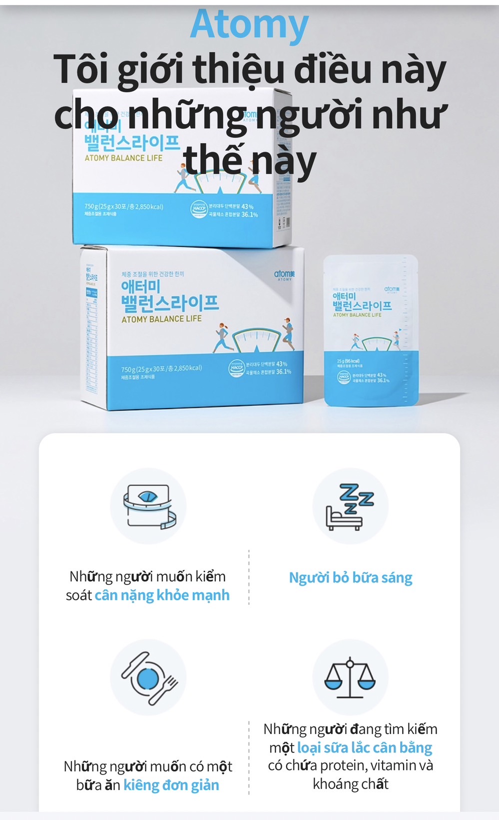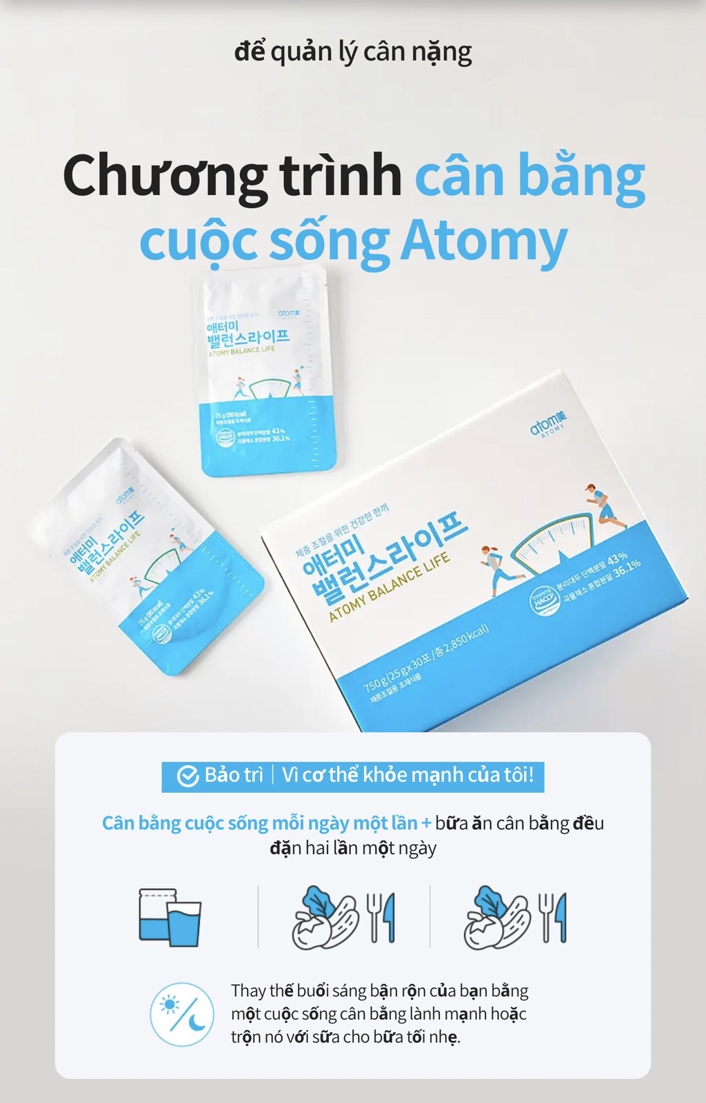 + Bạn muốn giảm cân: dùng 2 hộp Atomy Balance Life thay cho bửa ăn sáng và tối.