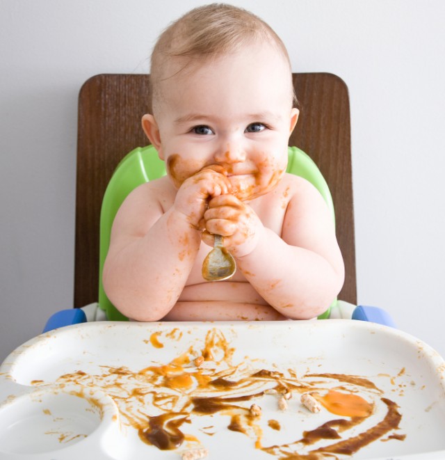 Em bé của bạn sẽ tự ăn một mình trước khi có khả năng làm được việc này có hiệu quả. Mặc dù việc này có khả năng làm bé bẩn – bạn cứ dự trù là thức ăn sẽ dính lên cả mặt, quần áo, tóc và thậm chí là rớt xuống cả sàn nhà nữa, và bữa ăn sẽ kéo dài, dây dưa, nhưng bạn nên khuyến khích bé, vì đây thực sự là bước đầu hướng bé tới sự tự lập.