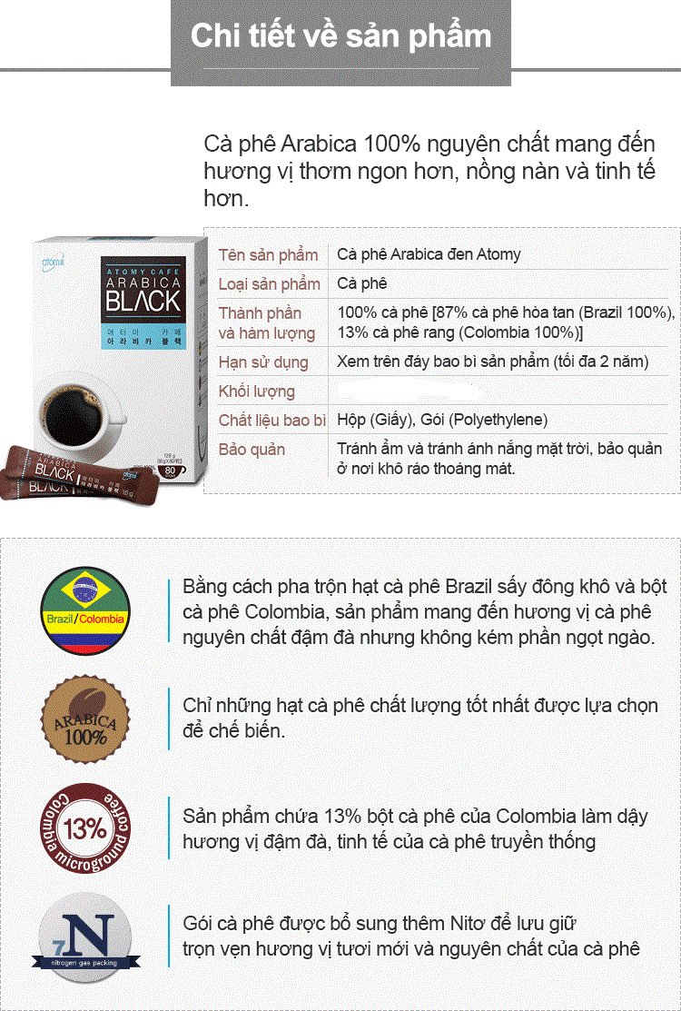 Thành phần: café hoà tan 87% ( Arabica Bazil), 13% café rang (Arabica Columbia).