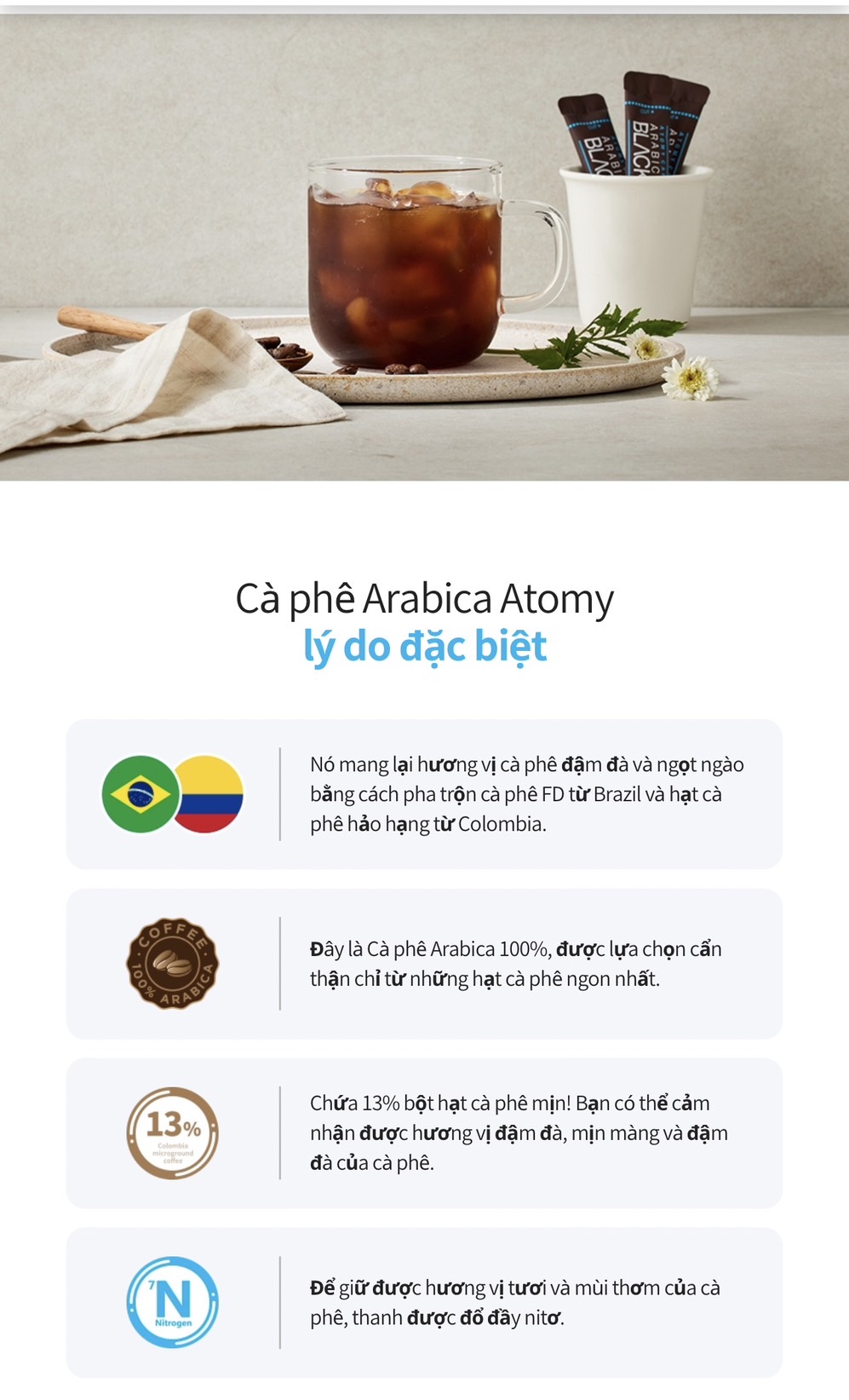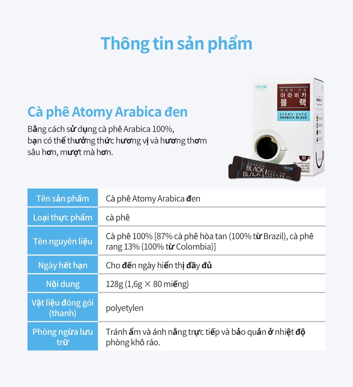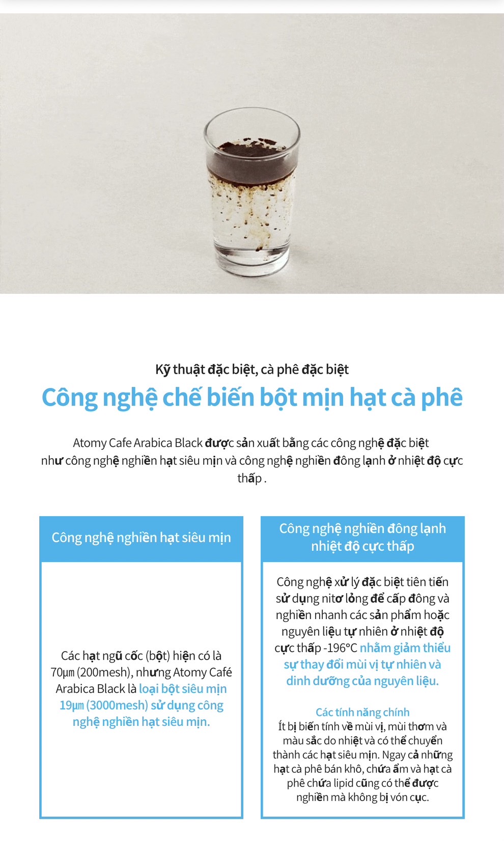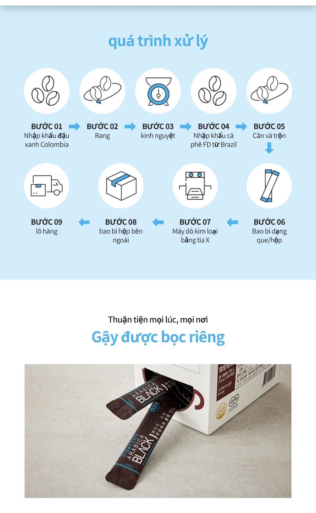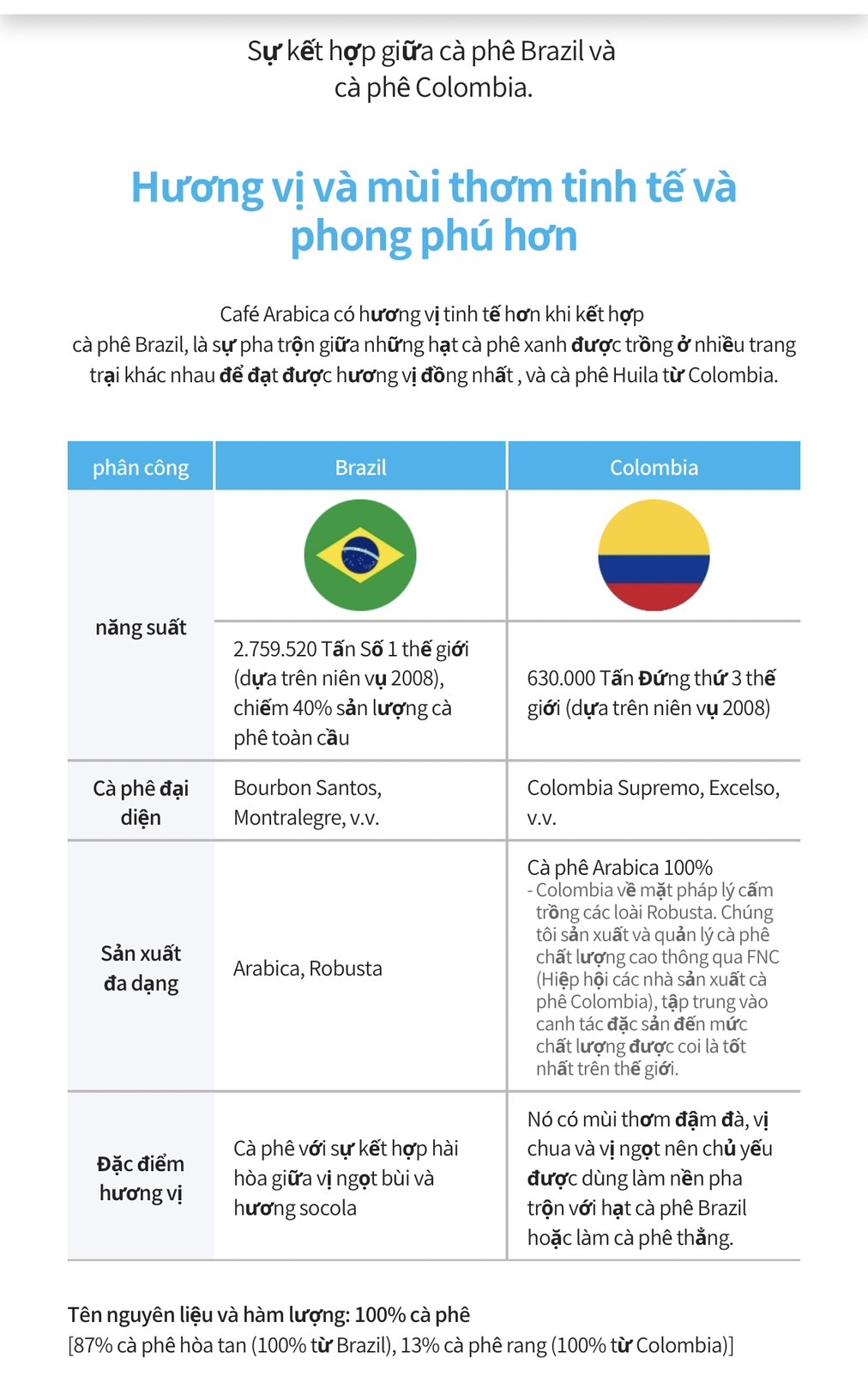 Thành phần: café hoà tan 87% ( Arabica Bazil), 13% café rang (Arabica Columbia).
