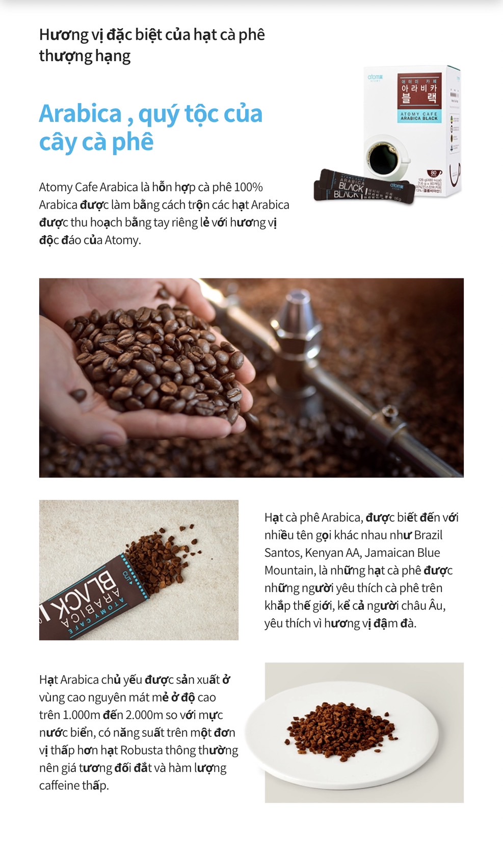 - Cà phê Arabica thường được trồng ở độ cao từ 900 m – 2.000m, hạt của café Arabica thường dài hơn, to hơn hạt Robusta. Dù lượng cafeine có trong arabica chỉ bằng 1 nữa so với robusta, nhưng café arabica lại có hương thơm nhẹ nhàng, vị chua thanh nên được da số người dân trên thế giới ưu chuộng hơn.