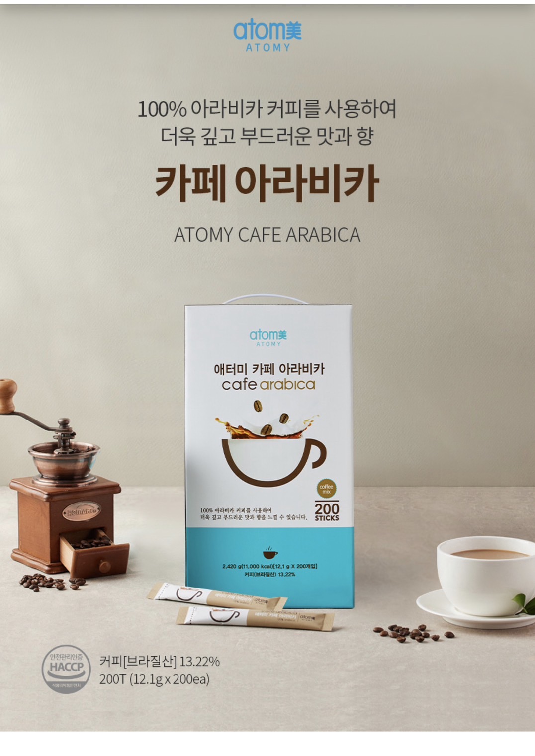 - Cà phê sữa Atomy Cafe Arabica được làm từ 100% hạt café Arabica chất lượng cao trồng tại Brazil kết hợp cùng với sữa bột Casein ( tổng hợp từ sữa bò nguyên chất) tạo hương vị đậm đà và hương café nồng nàng tự nhiên.