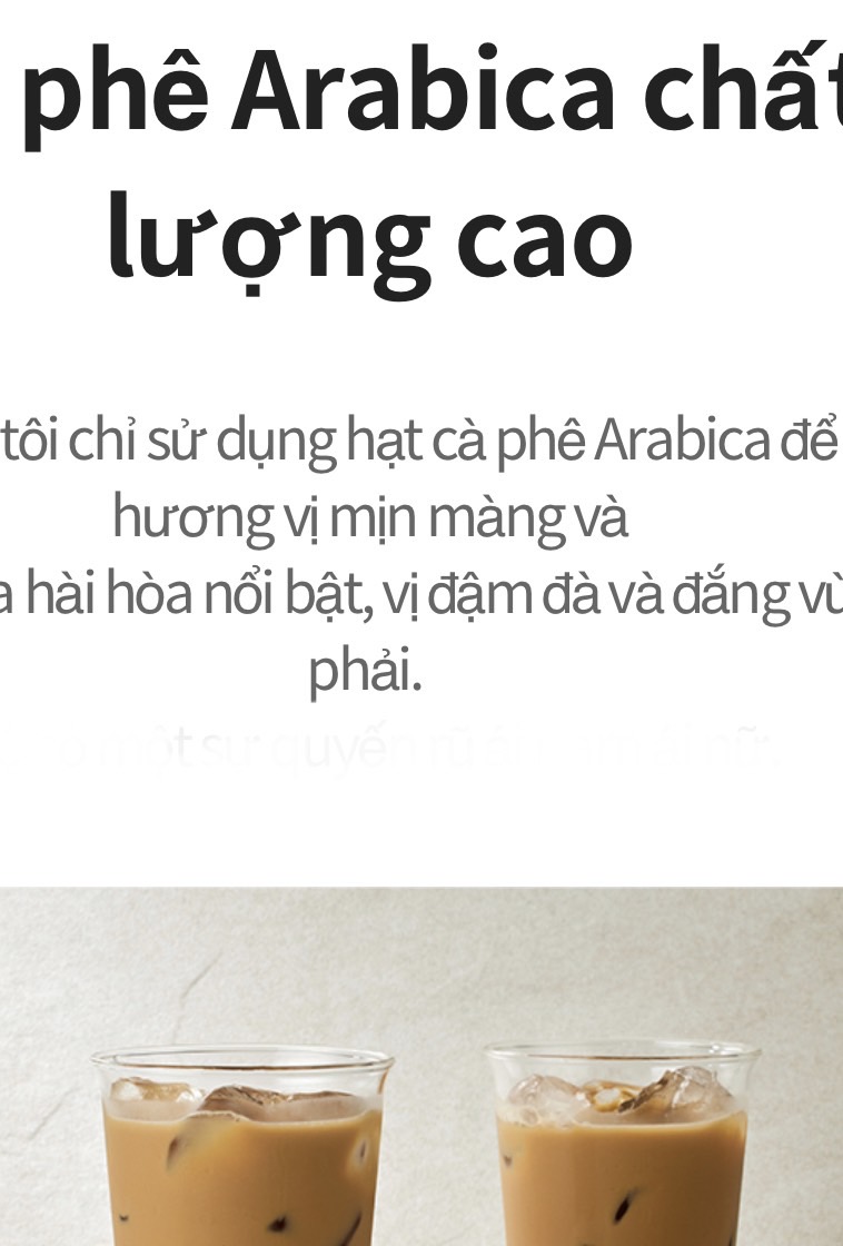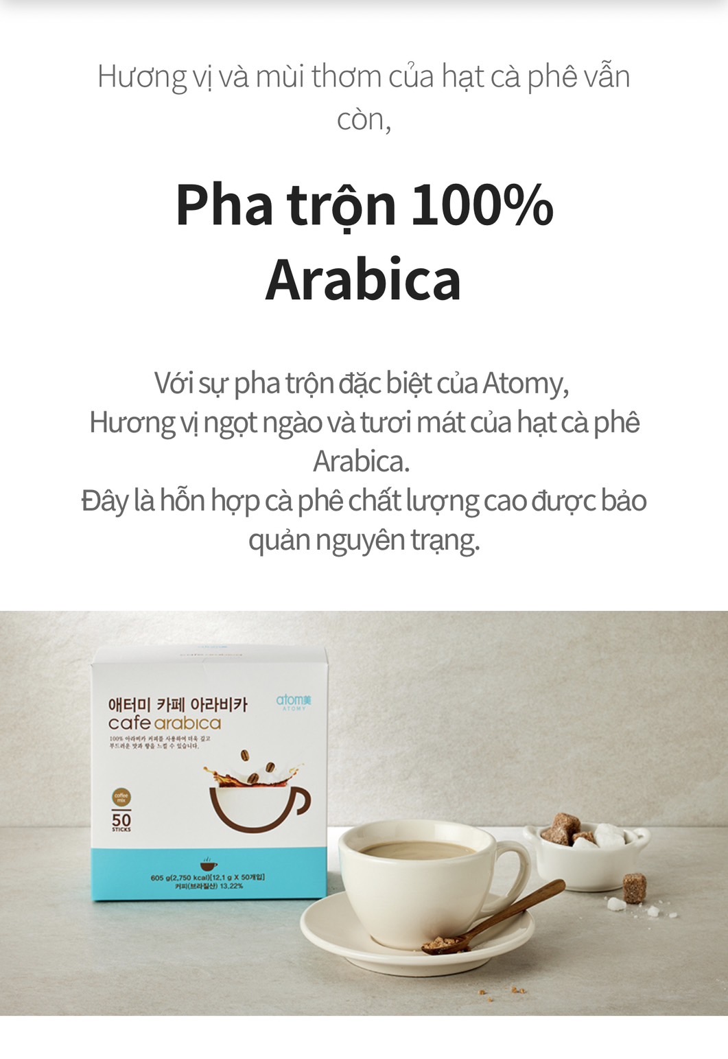 - Atomy sử dụng sữa bò chứ không dùng bột kem giống như nhiều loại café hòa tan thường thấy trên thị trường nên khi kết hợp với Café Arabica thì có hương vị thơm ngon hơn rất nhiều.