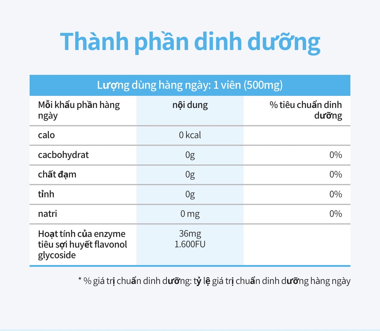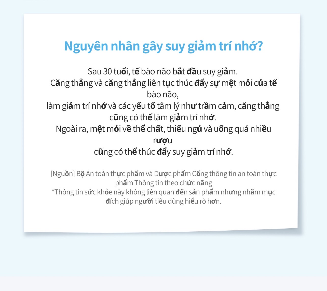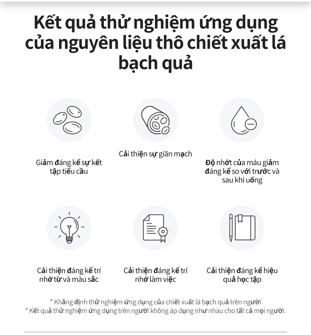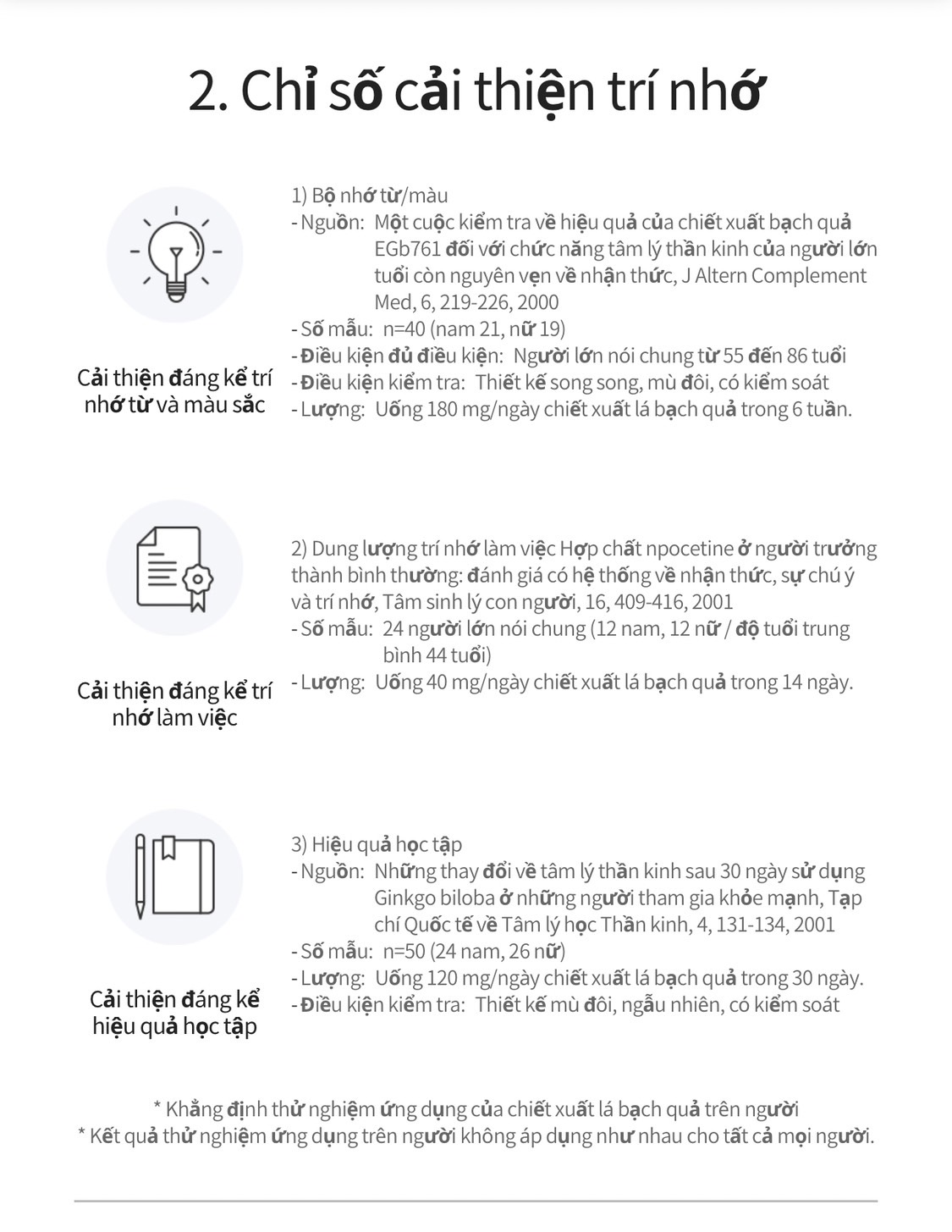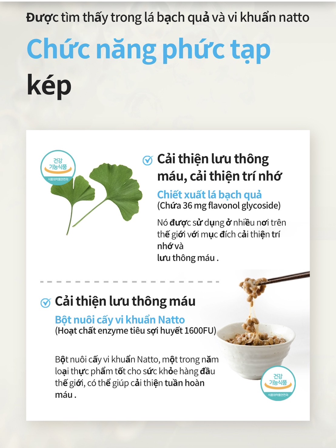Thành phần: Lá Ngân Hạnh, Đậu nành lên men Natto, hạt óc chó, trà xanh, gừng, cúc La Mã…